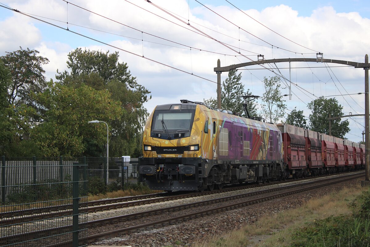 Die DB 189 084-7 der DB Cargo AG fährt am 08.10.2021 mit einem Kohlezug (bestehend aus 4-achsigen offenen Schüttgutwagen mit schlagartiger Schwerkraftentladung der Gattung Falns) durch den Bahnhof Bonn-Beuel in Richtung Norden.