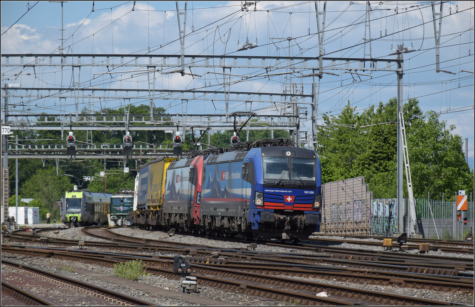 Während nebenan 193 526 'Maas' und 193 475 'Domodossola' der SBB Cargo international einen Güterzug Richtung Basel befördern, kündigte sich mit Pfeifen wahrlich Historisches von der in Burgdorf abzweigenden Strecke an. Mai 2025.