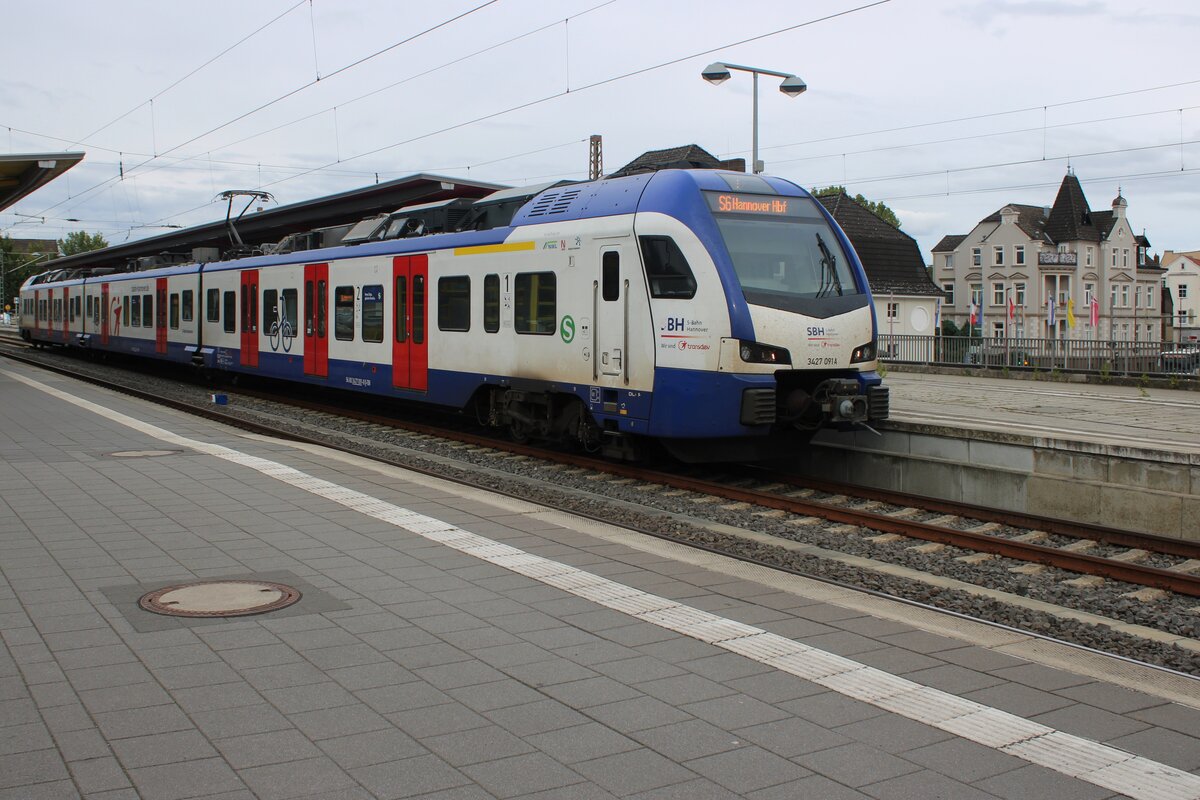 Der für die DB Regio AG – NRW fahrende dreiteilige Stadler FLIRT³ XL 3427 014 (94 80 3427 014-0 D-STAP / 94 80 3827 014-6 D-STAP / 94 80 3427 514-9 D-STAP) der ZV VRR Eigenbetrieb Fahrzeuge und Infrastruktur, erreicht am 13.08.2023, als RE 34 „Dortmund-Siegerland-Express“ (Siegen - Letmathe - Dortmund), bald den Bahnhof Kreuztal.
