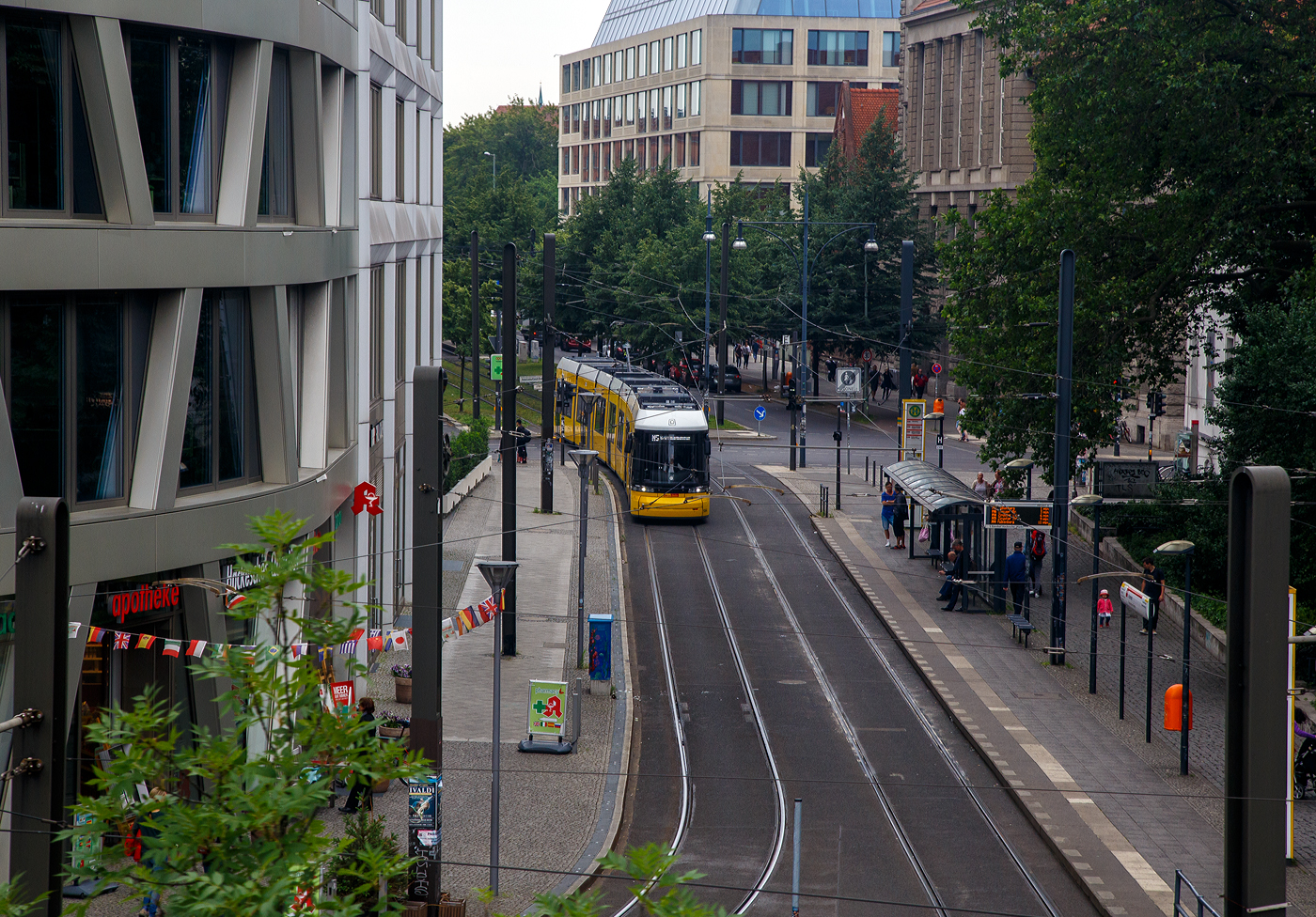 Der Triebwagen BVG 9061 ein siebenteiliger Niederflur-Gelenktriebwagen vom Typ Bombardier „Flexity Berlin“ vom Typ GT8-08 ZR / BVG Bezeichnung F8Z, erreicht am 24. Juni 2017, als MetroTram Linie M4 die Haltestelle S-Bahnhof Hackescher Markt (Berlin). Das Bild konnte ich aus einem EC aufnehmen. Der Niederflur-Straßenbahnwagen wurde 2017 von Bombardier unter der Fabriknummer 759/9061 gebaut, die Inbetriebnahme bei der BVG war am 09.03.2017, so war er hier gerademal 3 Monate im Einsatz. Die vier Vorserienzüge der „Flexity Berlin“ entstanden komplett im Werk Bautzen, das für die Serienproduktion lediglich den Rohbau in das Bombardier-Werk Hennigsdorf liefert. Dort erfolgt mit Zulieferungen aus Mannheim und Siegen (Drehgestelle) die Endmontage und Inbetriebnahme. Das Werk Hennigsdorf liefert jährlich 20 bis 24 Züge aus. Der Bombardier Flexity Berlin ist ein Niederflur-Straßenbahnwagen der Flexity-Reihe von Bombardier Transportation. Er ist eine Weiterentwicklung basierend auf dem Adtranz Incentro. Im Zuge der Erneuerung ihrer Straßenbahnflotte bestellten die Berliner Verkehrsbetriebe (BVG) 100% Niederflurfahrzeuge des Typs BOMBARDIER FLEXITY Berlin. Zunächst (2008) wurden vier Vorserienfahrzeuge in verschiedenen Konfigurationen geliefert: je ein Ein- und Zweirichtungsfahrzeug mit einer Länge von 30,8 m (fünfteiliger GT6-08) sowie je ein Ein- und Zweirichtungsfahrzeug mit einer Länge von 40 m (siebenteiliger GT8-08). Aktuell (2025) sind 233 „Flexity Berlin“ vom Typ GT6 bzw. 8-08 bei der BVG. Bombardier und die BVG haben gemeinsam ein zukunftsweisendes Fahrzeugkonzept erstellt, gemäß den Ansprüchen an moderne öffentliche Verkehrsmittel. Durch breite Doppeltüren und ebene Einstiege bieten die neuen Berliner Straßenbahnen besonders leichte Zugänglichkeit und werden den Bedürfnissen von Fahrgästen mit eingeschränkter Mobilität gerecht. Die Fahrzeugbreite von 2,4 Metern schafft einen geräumigen Fahrgastraum mit optimaler Raumausnutzung. Großzügige Multifunktionsbereiche bieten ausreichend Platz für Kinderwagen, Rollstühle und Fahrräder. Für angenehme Temperaturen sorgt eine Klimaanlage im Fahrer- und Passagierbereich. TECHNISCHE DATEN (GT8-08 ZR): Spurweite: 1.435 mm (Normalspur) Achsfolge: (Bo)' (Bo)' 2´(Bo)' Länge: 40.000 mm Höhe: 3.450 mm Breite: 2.400 mm Achsabstand im Drehgestell: 1.800 mm Leergewicht: 51,5 t Höchstgeschwindigkeit: 70 km/h Beschleunigung: 0,65 m/s² Raddurchmesser: 660 mm (neu) / 580 mm (abgenutzt) Stromsystem: 600 V und 750 V Gleichstrom (mit Energierückspeisung ins Netz) Stromübertragung: Oberleitung Fahrmotoren: 12 wassergekühlte Drehstrom-Asynchronmotoren vom Typ DKWBZ 1606-4 Dauerleistung: 12 x 50 kW = 600 kW Sitzplätze: 69 Stehplätze: 174 Fußbodenhöhe: 355 m Türen (je Seite): 5 elektrische doppelflügelige Außenschwenkschiebetüren, lichte Breite 1.300 mm Niederfluranteil: 100 % Kleinster bef. Halbmesser: 17,25 m Bremsen: Scheibenbremse; elektrohydraulische Federspeicherbremse; Magnetschienenbremse 8 x 68 kN Die Straßenbahn Berlin: Die Berliner Straßenbahn ist eines der ältesten und das drittgrößte Straßenbahnnetz der Welt (Stand: 2017), nach denen in Melbourne und Sankt Petersburg. Betreiber sind die 1929 gegründeten Berliner Verkehrsbetriebe (BVG). Das normalspurige (1.435 mm) Netz hat eine Streckenlänge von 193,6 Kilometern und 808 Richtungshaltestellen. Die Fahrdrahtspannung der Oberleitung beträgt derzeit noch 600 V, wobei eine Umstellung auf 750 V diskutiert wird. 22 Linien bilden ein Liniennetz von rund 300 Kilometern. Im Jahr 2016 beförderte die Berliner Straßenbahn 197 Millionen Fahrgäste. In Berlin gab es seit 1865 eine Pferdebahn. Bis Ende des 19. Jahrhunderts wurde das Netz auf elektrischen Betrieb umgestellt. Mit der Teilung der Stadt, nach dem 2. Weltkrieg, wurde die BVG in einen westlichen und einen östlichen Betrieb gespalten, die 1992 wieder vereinigt wurden. In West-Berlin (Westsektoren) wurden bis 1967 alle Straßenbahnlinien stillgelegt. Mit Ausnahme von drei Streckenteilen, die nach der deutschen Wiedervereinigung in den Westteil der Stadt verlängert wurden, verkehrt die Straßenbahn heute nur noch im ehemaligen Ostteil der Stadt. Es war einmal: Die BVG betrieb im Gründungsjahr der 93 Straßenbahnlinien und ein Netz mit 634 Kilometern Streckenlänge, besaß 4.000 Straßenbahnfahrzeuge und beschäftigte 14.400 Personen allein bei der Straßenbahn. Die Straßenbahn leistete pro Jahr 170 Millionen Wagenkilometer und beförderte 929 Millionen Fahrgäste. In Westberlin: Ab 1954 gab es in West-Berlin eine Änderung der Verkehrspolitik, die auf einen Ersatz des Straßenbahnverkehrs durch Erweiterung der U-Bahn- und Omnibusstrecken zielte. Die Straßenbahn wurde als veraltet und überflüssig betrachtet. Ab 1954 wurden die Straßenbahnlinien nach und nach durch Omnibusse und in Einzelfällen durch die in den Folgejahrzehnten großzügig ausgebaute U-Bahn ersetzt. Ende 1962 gab es im Westteil der Stadt nur noch 18 Straßenbahnlinien. Am 2. Oktober 1967 wurde in West-Berlin die letzte Straßenbahnlinie mit der Nummer 55 stillgelegt.