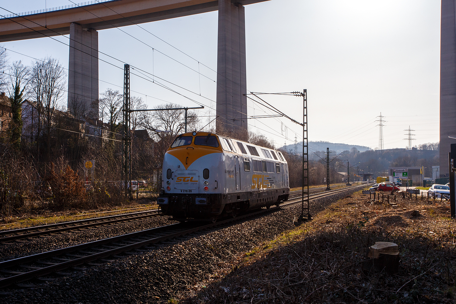 Die 50 3501-9 des Meininger Dampflokwerkes, ex DR 50 3501-9, ex DR 50 380, fährt am 25.03.2018 mit einem Dampfsonderzug der Eisenbahnfreunde Treysa e.V. (Jubiläumsfahrt - Rundfahrt über Siegen) über die Siegstrecke nach Siegen. Hier durchfährt der Zug Eiserfeld, im Hintergrund die 105 m hohe Siegtalbrücke der A45 (Sauerlandlinie).