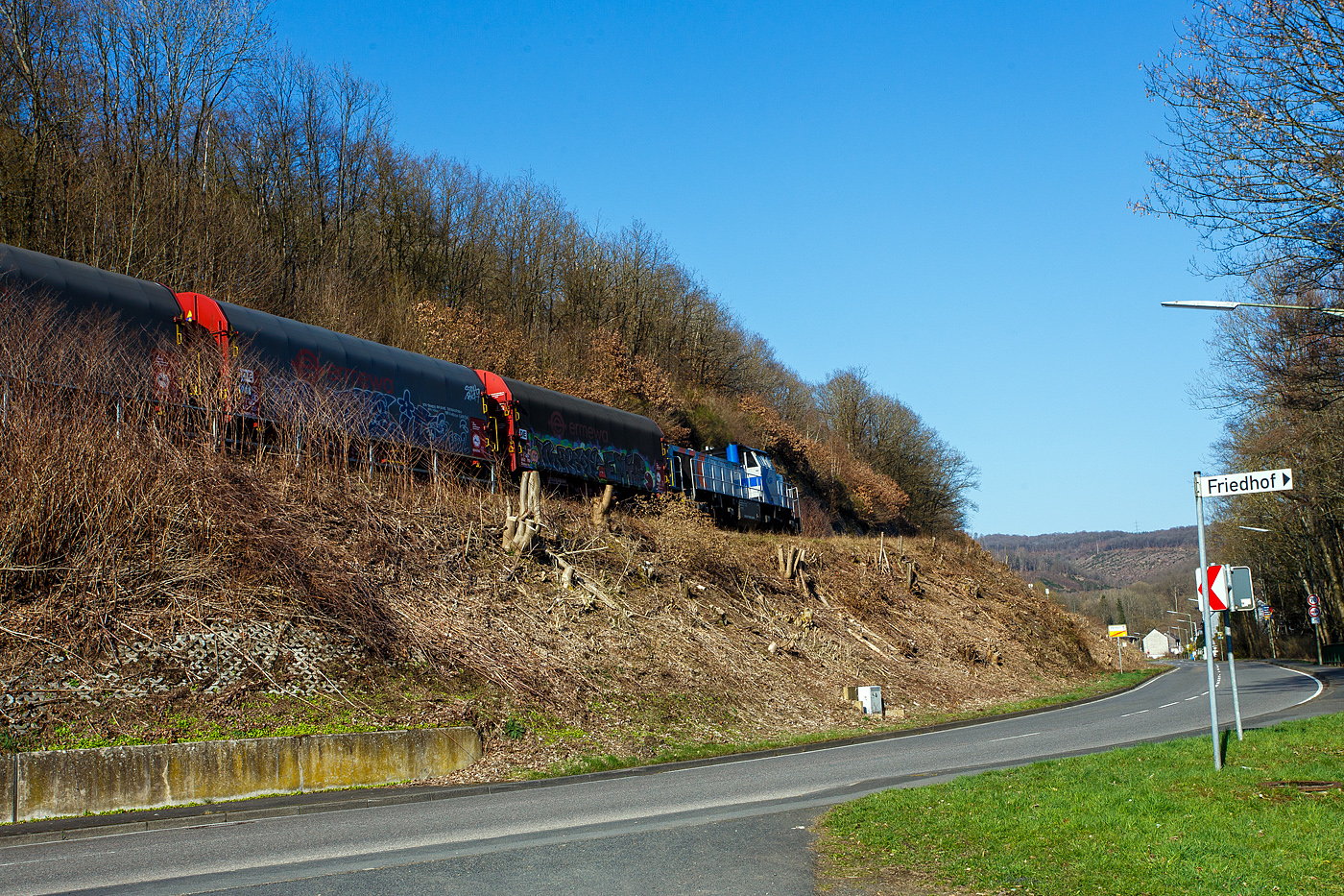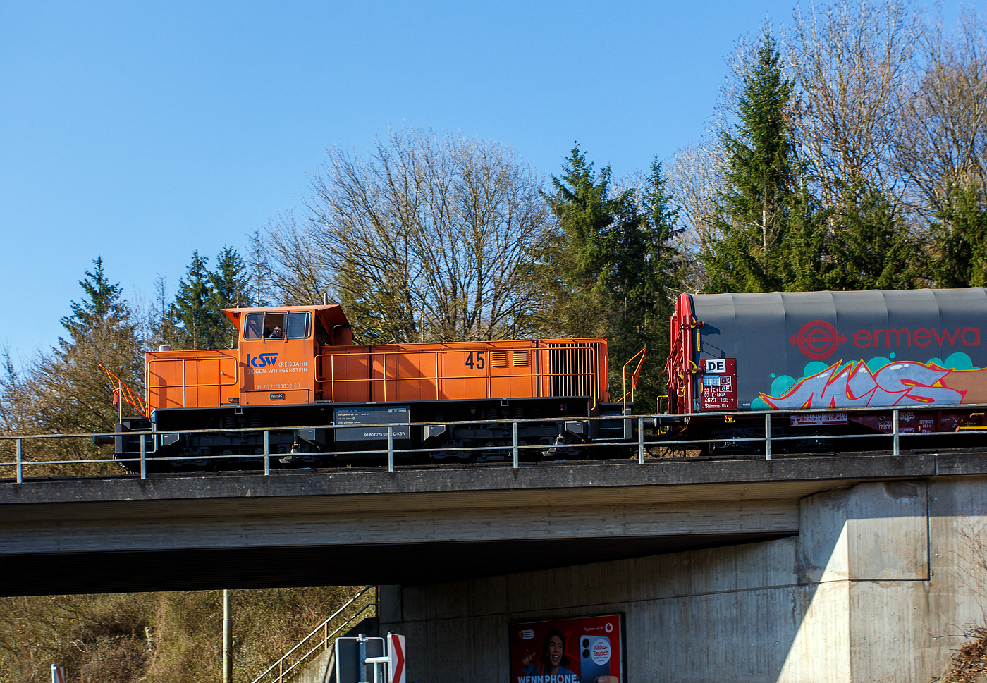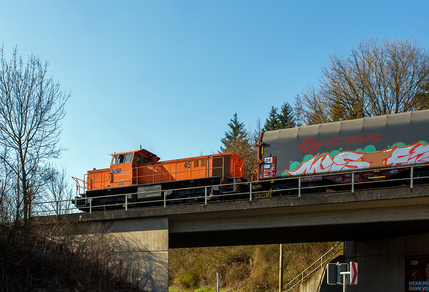 Die KSW 44 (92 80 1271 004-4 D-KSW) eine MaK G 1000 BB der KSW (Kreisbahn Siegen-Wittgenstein), eine MaK G 1000 BB, hat am 30.11.2022 bereits Güterwagen, auf dem KSW Rangierbahnhof Herdorf (Freien Grunder Eisenbahn KSW NE447 / DB-Nr. 9275), abgestellt. Nun fährt sie vom KSW Rbf auf Gleis 2 vom Bf Herdorf, nach dem umstellen der Weiche und dem Fahrtrichtungswechsel geht es dann über die Hellertalbahn in Richtung Burbach.