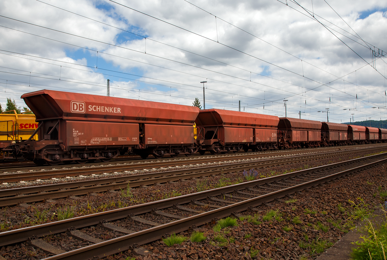 Vierachsige offene Schüttgutwagen mit schlagartiger Schwerkraftentladung und hydraulischem Klappenverschlusssystem, 81 80 6639 491-2 D-DB, der Gattung Falns 183 der DB Cargo AG am 14.02.2023 im Zugverband bei einer Zugdurchfahrt in Niederschelden (Sieg).