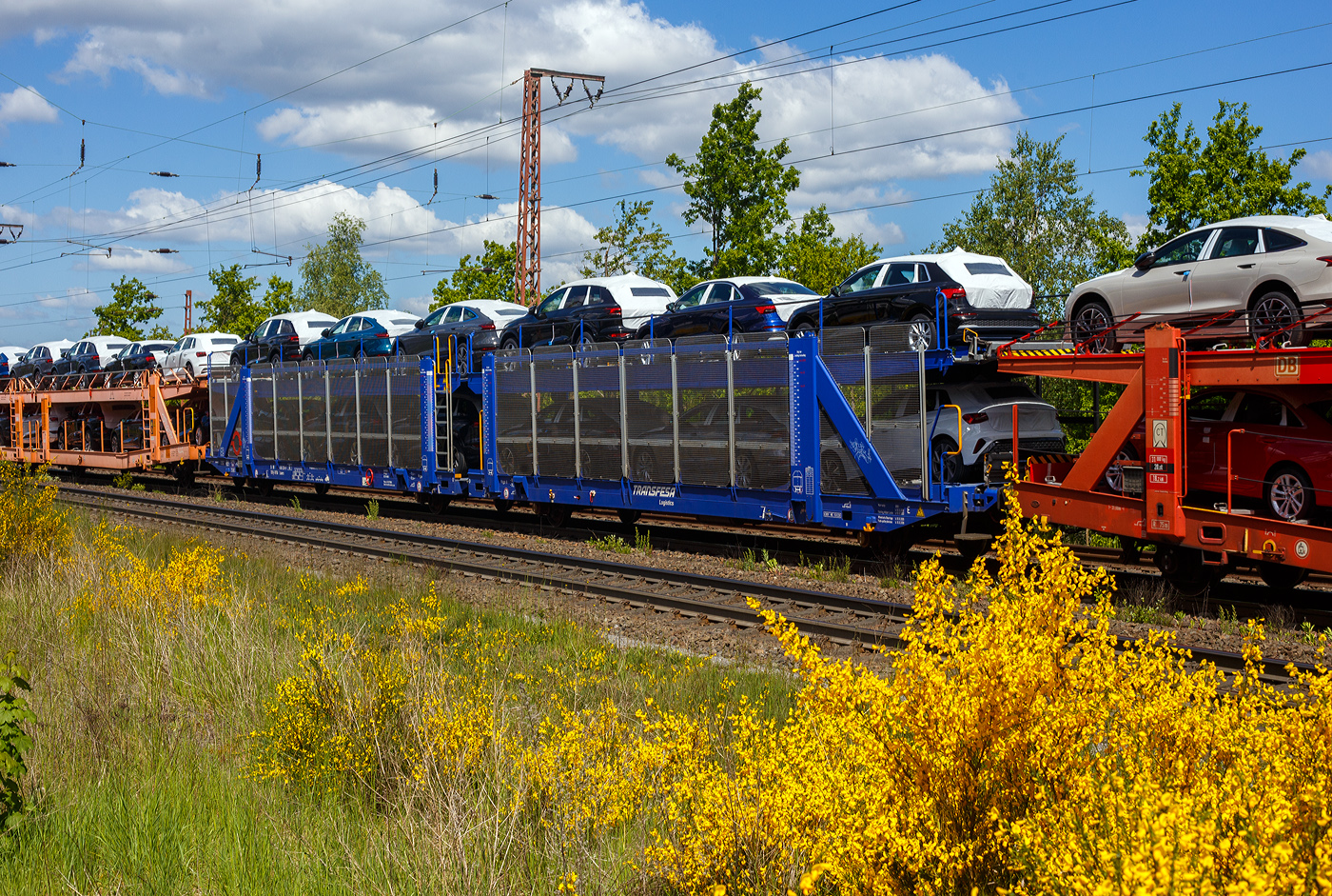 Vierachsige (2 x 2 achsige) lange Flachwageneinheit mit abgesenktem Fußboden und Radvorlegern der TRANSWAGGON GmbH, der Gattung Laadkks (TWA 850 RV), 27 80 4348 009-6 D-TWA, beladen mit 4 Nutzfahrzeuge (FIAT - Kastenwagen), 14 Juli 2024 im Zugverband bei einer Zugdurchfahrt im Bahnhof Kirchen (Sieg).