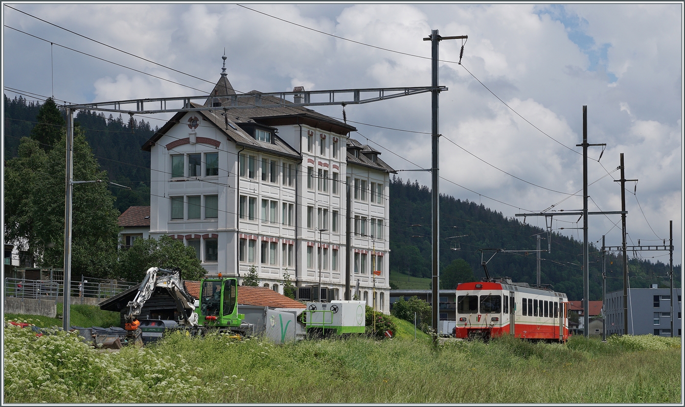 Eine kleine Triebwagenparade in Le Locle: Auf Gleis 1 steht der SBB RABe 523 077 der langfristig an die TRN/TransN vermietet wurde, er wird um 11:20 als Regio 20 6331 nach Neuchâtle fahren. Auf Gleis 2 ist der SNCF Z 76715 als TER 18107 von Besançon-Viotte nach La Chaux-de-Fonds unterwegs und wird seinen Bahnsteig 2 hinter dem der TRN BDe 4/4 N° 3 erreichen. Der ex cmn BDe 4/4 N° 3 (Jahrgang 1950) wartet seinerseits auf die Abfahrt als R 24 14 nach Les Brenets.