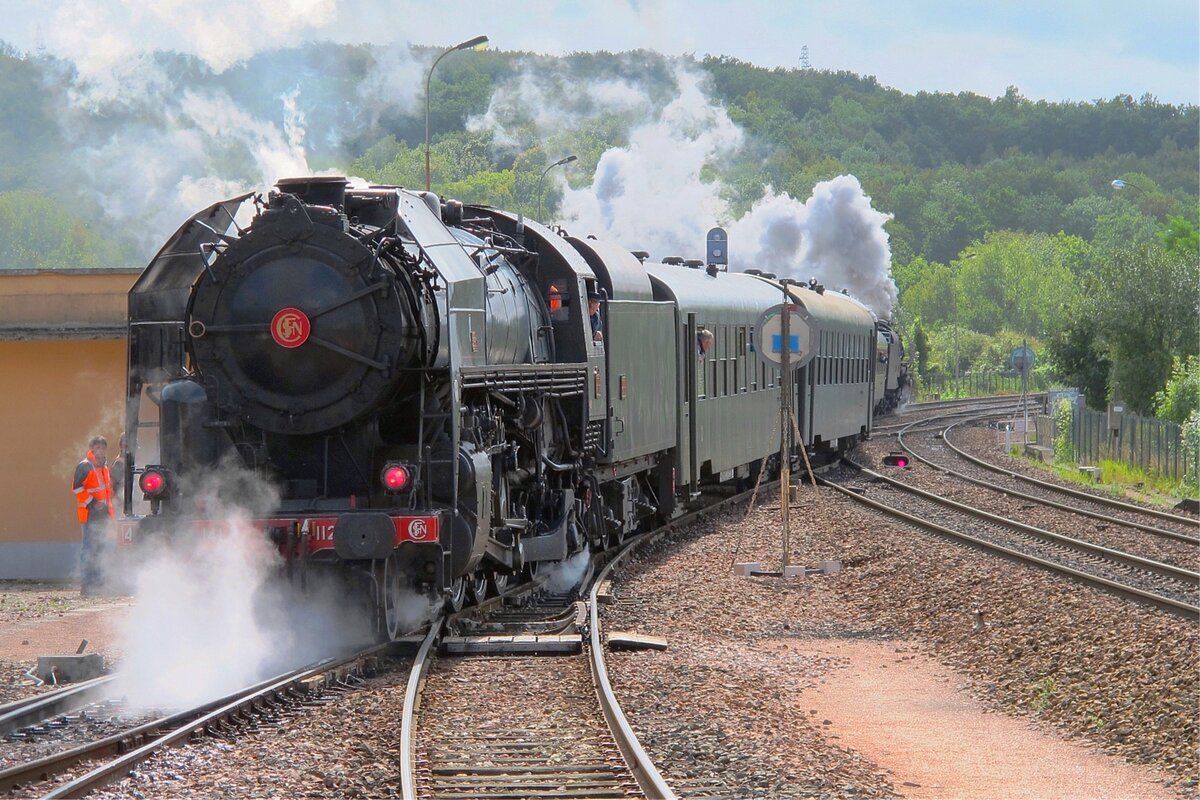 Nach einem kurzen Halt setzt sich die mächtige (ex) SNCF Dampflok 141 R 568 der "L'Association 141R568" mit ihrem Extrazug wieder in Bewegung. Das Ziel der Fahrt ist dieses Jahr Thun. 25. Mai 2024