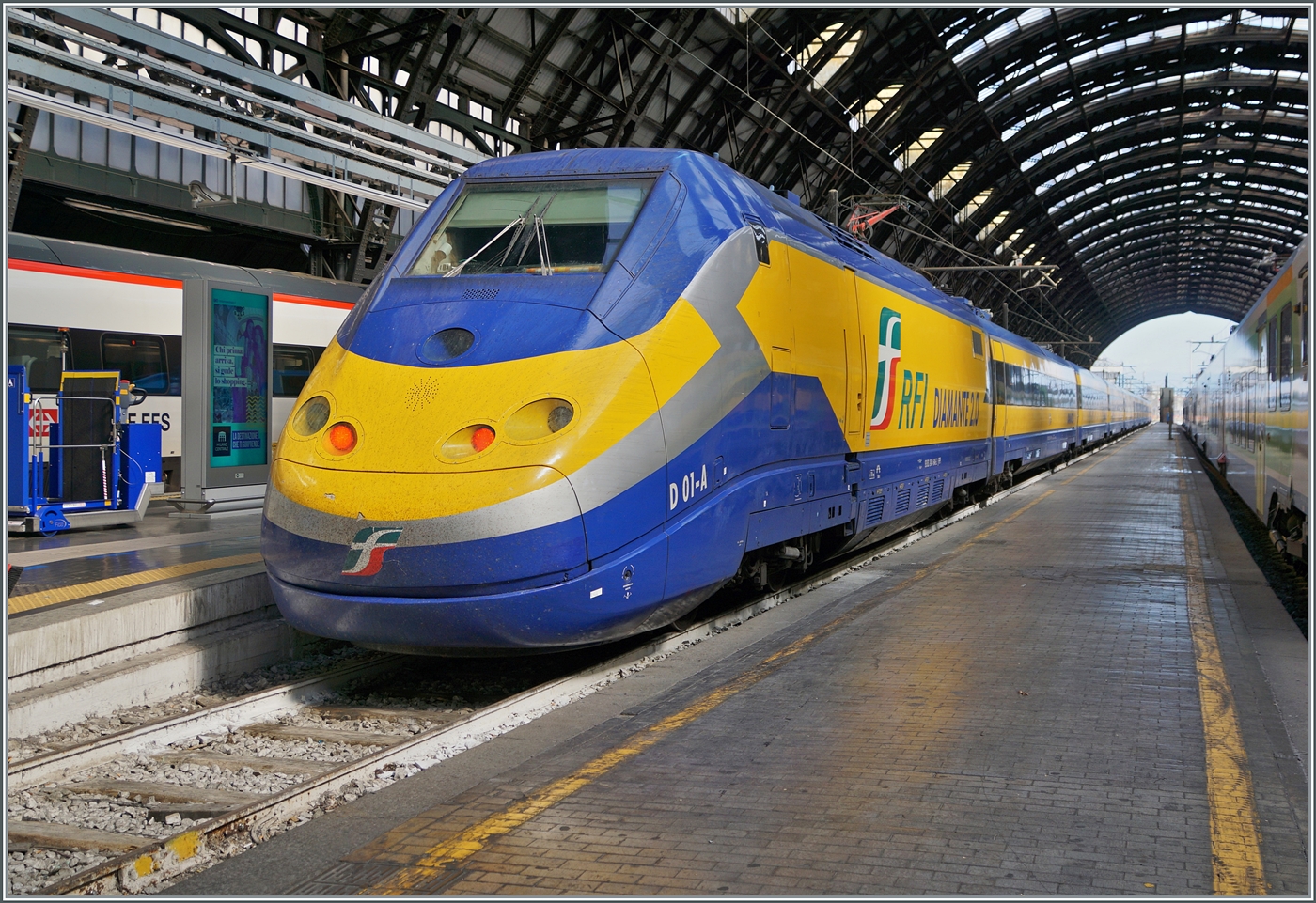 Ein SBB RABe 501 „Giruno“ bzw. „Bussard“ erreicht am 23.07.2022 den Bahnhof Milano Centrale, in der Bildmitte das alte Stellwerk /Posto di movimento) "Cabnina A" und rechts die "Cabnina C".