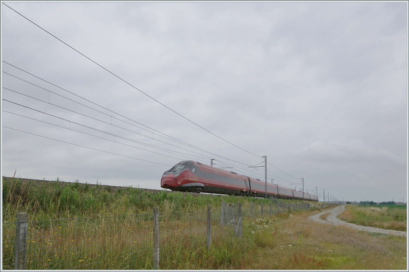Auf der Schnellfahrstrecke Torino - Milano (RFI Streckennummer 9, Länge 127 km) ist der .Italo NTV ETR 575 018 als ITALO 9927 auf dem Weg nach Napoli. Das Bild entstand bei Livorno Ferraris in der Po-Ebene.