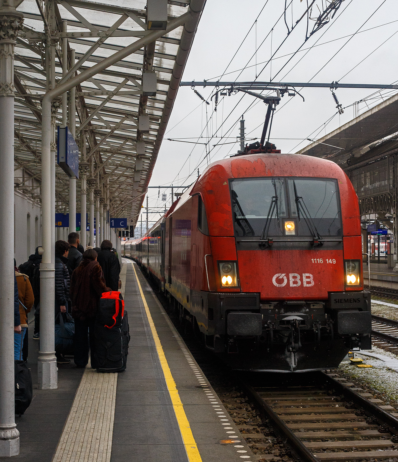 Die Taurus II - ÖBB 1116 149 (91 81 1116 149-6 A-ÖBB) der ÖBB-Produktion GmbH erreicht, mit über 30 Minuten Verspätung, mit dem EC 218 „Chiemgau“ (von Graz Hbf über Leoben, Selzthal, Bischofshofen, Salzburg Hbf, München Hbf, Stuttgart Hbf und Darmstadt Hbf nach Frankfurt am Main Hbf), am 15 Januar 2025 den Hauptbahnhof Salzburg. In Salzburg hat der Zug zudem wegen dem Personalwechsel zwischen ÖBB und DB einen planmäßigen Aufenthalt von 15 Minuten.