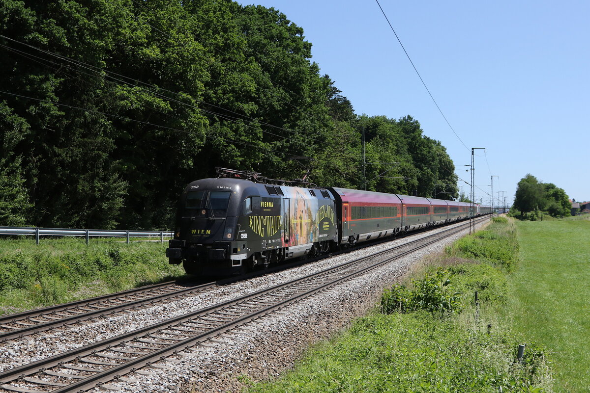 1116 216 "200 Jahre Johann Strauss" war am 19. August 2025 bei Vachendorf schiebend an einem "Railjet" in Richtung Salzburg im Einsatz.