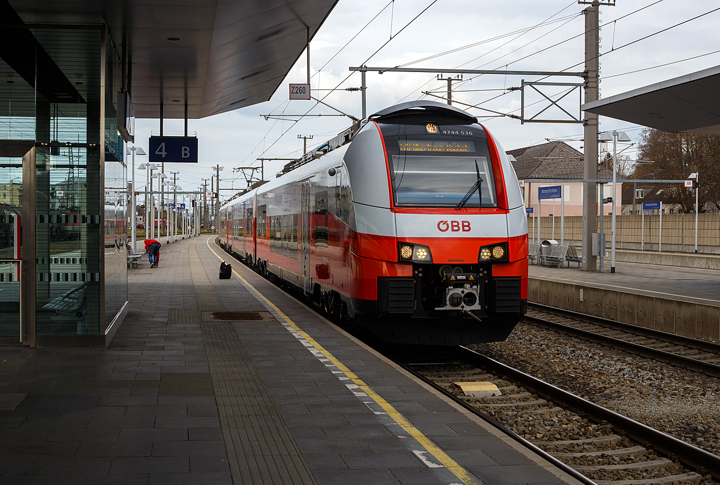 Der ÖBB 4023 011-4, ein dreiteiliger Elektrotriebzug der ÖBB Reihe 4023 vom Typ Bombardier TALENT (Talbots leichter Nahverkehrs-Triebwagen), erreicht am 04 April 2025, als R 2 / S2 von Freilassing nach Linz Hbf., den Bahnhof Lambach.