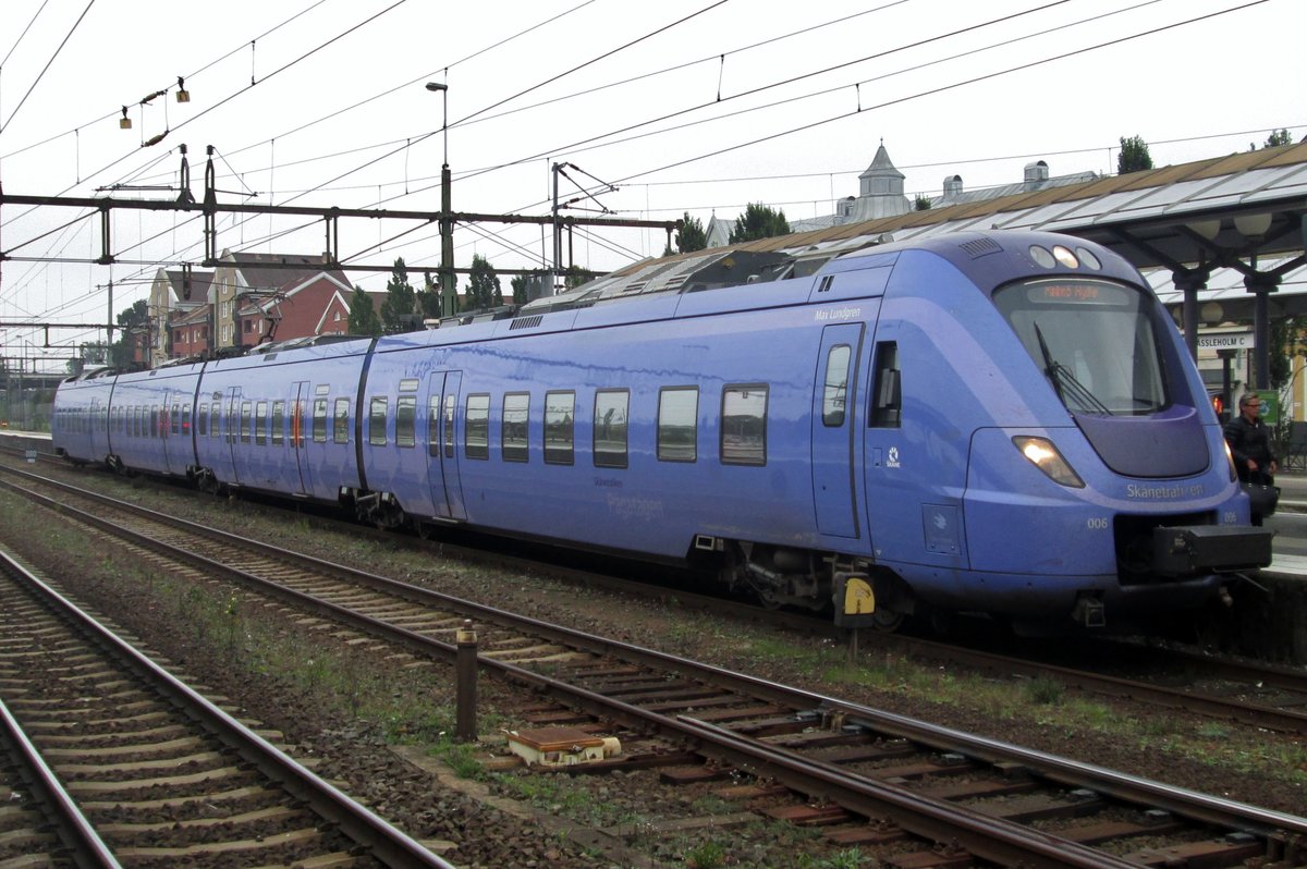 Der Skånetrafiken X 61 081 „Elin Wägner“ (94 744 610 081-2 S-Skåne), ein vierteiliger Elektrotriebzug vom Typ Alstom Coradia Nordic, erreicht am 22.03.2019 den schönen oberirdischen Bereich von Malmö Central. Er fährt als Pågatågen die Linie 4b (Kristianstad C - Hässleholm C - Malmö C – Hyllie). Pågatågen ist eine Regionalbahn im südschwedischen Schonen (schwedisch Skåne). Der Pågatåg wird durch das Eisenbahnunternehmen Arriva Tåg AB im Auftrag von Region Skåne und Skånetrafiken betrieben. Der X61 ist ein vierteiliger, normalspurige elektrische Triebwagenzug vom Typ Alstom Coradia Nordic der seit 2009 von der Alstom Transport Deutschland GmbH in Salzgitter (vormals Alstom LHB) gebaut wird. Die Triebzüge Alstom Coradia Nordic gehören zur Fahrzeugfamilie modularer, vollständig niederfluriger Nahverkehrs-Gliedertriebzüge Alstom Coradia LIREX. Aus dem Konzept ist durch Fortentwicklung eine Familie von vollständig niederflurigen Triebzügen mit konventionellen Enddrehgestellen und Jakobs-Drehgestellen zwischen den Mittelwagen entstanden. Dabei wurde zuerst die für den Betrieb in nordischen Ländern geeignete Unterfamilie Coradia Nordic entwickelt und später daraus die Unterfamilie Coradia Continental für den Eisenbahn-Betrieb in Mitteleuropa abgeleitet. Nachdem die ersten Fahrzeuge als X60 bei SL (AB Storstockholms Lokaltrafik) in Betrieb waren, wurden weitere, ähnliche Fahrzeuge von anderen Eisenbahngesellschaften in Schweden bestellt. Bei diesen Aufträgen handelt es sich um kürzere, vierteilige Versionen, die als X61 und X62 bezeichnet werden. TECHNISCHE DATEN: Spurweite: 1435 mm (Normalspur) Achsformel: Bo'(Bo')(2')(Bo')Bo' Länge über Kupplung: 74.300 mm Breite: 3.258 mm Höhe: 4.280 mm Dienstgewicht: 160 t Höchstgeschwindigkeit: 160 km/h Leistung: 2.000 kW Stromsystem: 15 kV 16,7 Hz ~ Sitzplätze: 234