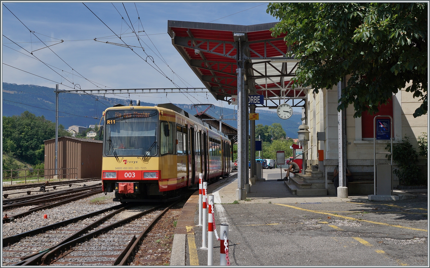 Der Travys OC Be 4/8 N° 3 (94800 450 003-9 D-TVYS) ist in Orbe angekommen und wartet nun auf die Rückfahrt als R11 26845.
