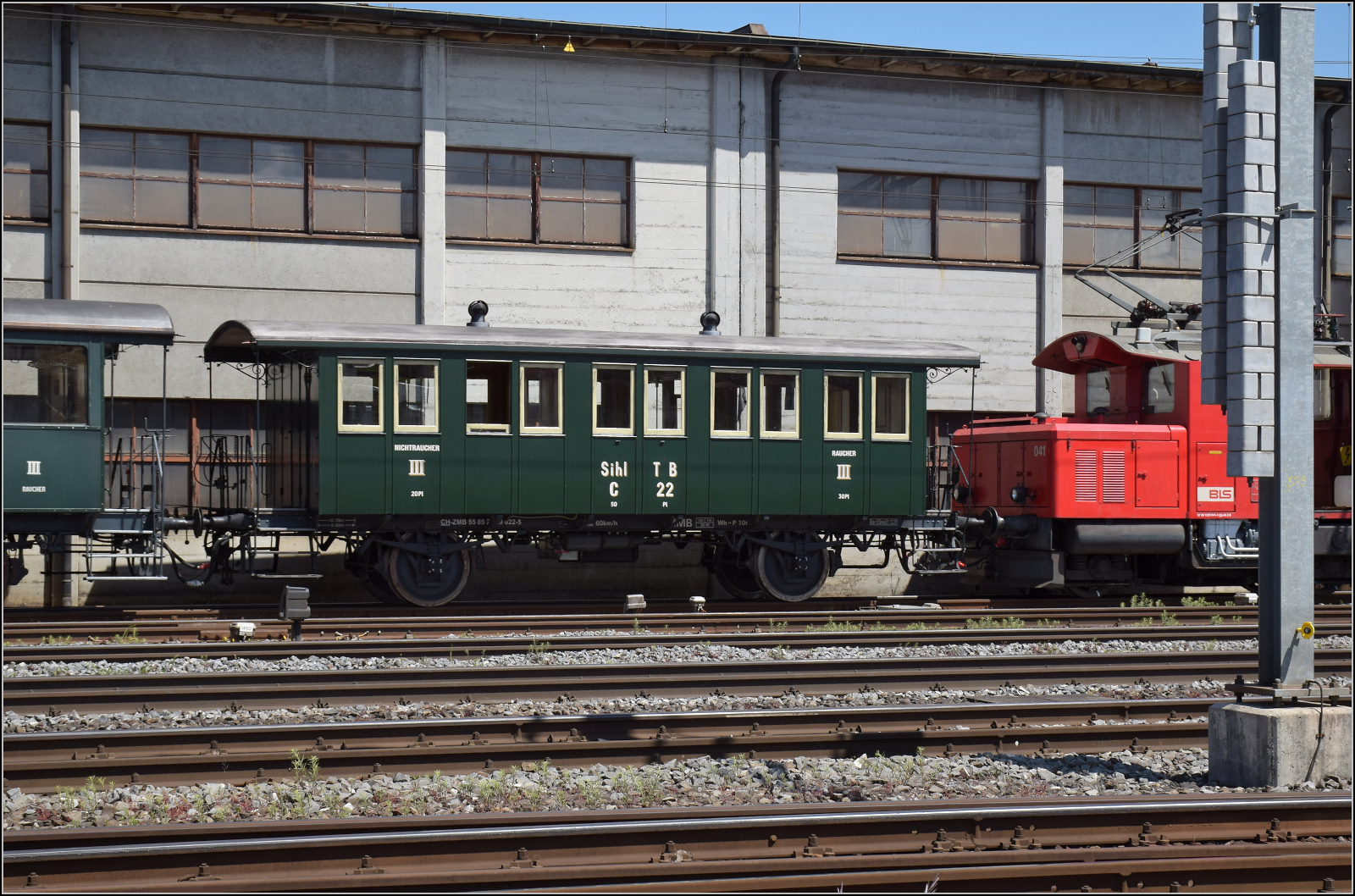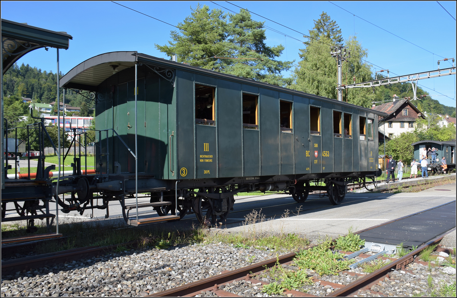 Hier im Vordergrund (als Hauptmotiv) der 2-achsige 1. u. 2. Klasse Abteilwagen ex RhB AB 121, der Museumsbahn Blonay-Chamby. Ein ehemals luxuriöser Wagen für die Albulabahn (mit 4 Abteilen und WC), erkennbar an der originellen Fenstereinteilung.