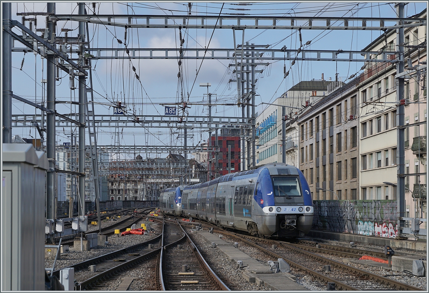 Der SNCF Z 27755 (nicht zu sehen an der Zugspitze) und der Z 27742 (am Schluss des Zuges) verlassen Genève als TER nach Lyon.