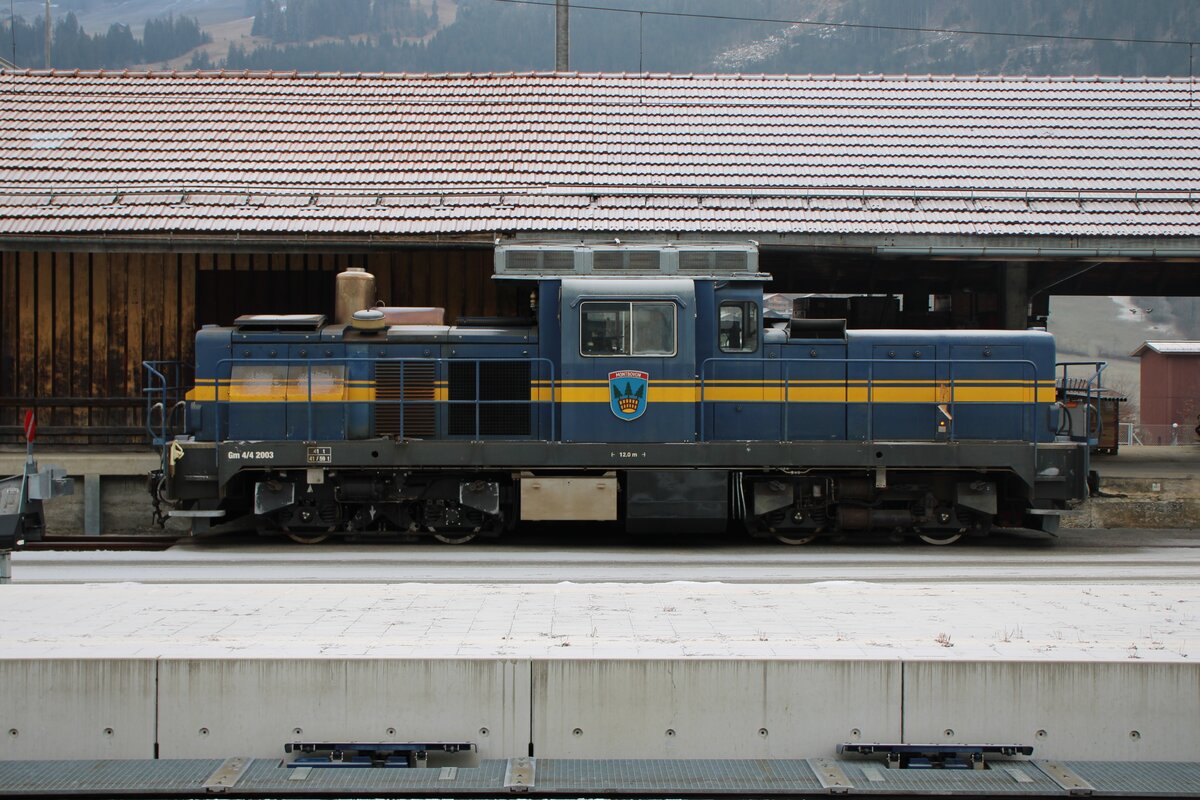 Die MOB Gm 4/4 2003 "Montbovon" steht in Vevey und wartet auf ihren nächsten Einsatz. Die MOB erhielt 1976 die Diesellok Gm 4/4 2003, um ein leistungsfähiges, fahrleitungsunabhängiges Fahrzeuge für entsprechende Einsätze zur Verfügung zu haben. Die französische Firma Moyse in La Courneuve konstruier die Lok, die sich bei der MOB sehr bewährte, so dass die MOB eine zweite Gm 4/4 bestellte. 11. Mai 2023