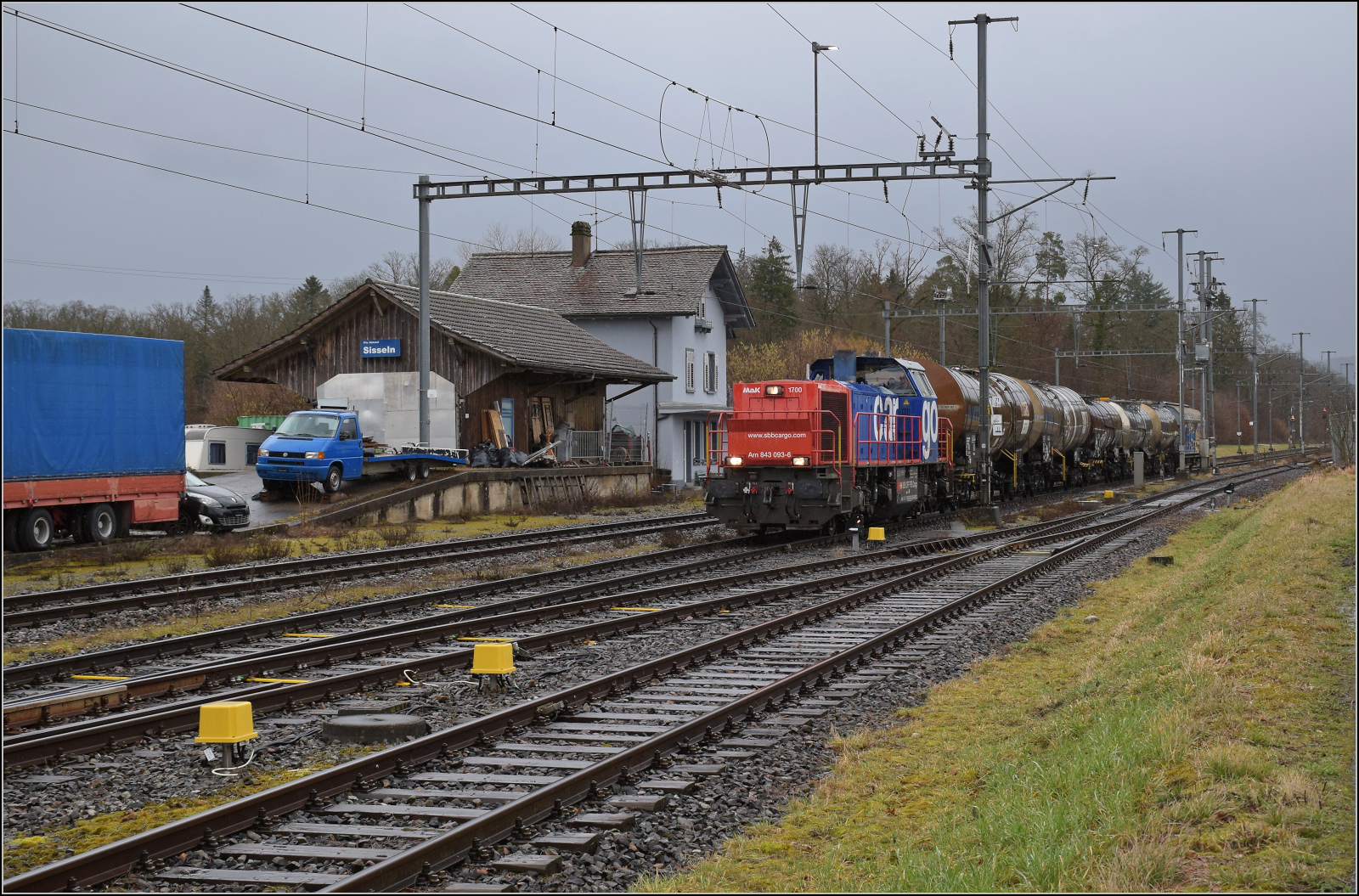 Am 843 020 der SBB Infrastruktur fährt mit einer Nivelier-Richt-Stopfmaschine B 758 von Scheuchzer (CH-SCHEU 40 85 9581 078) und dessen Anhänger B 762 zum Bürsten des Schotterbetts ist offenbar auf einer Drehfahrt von Brugg zurück nun in Richtung Basel. Februar 2026.