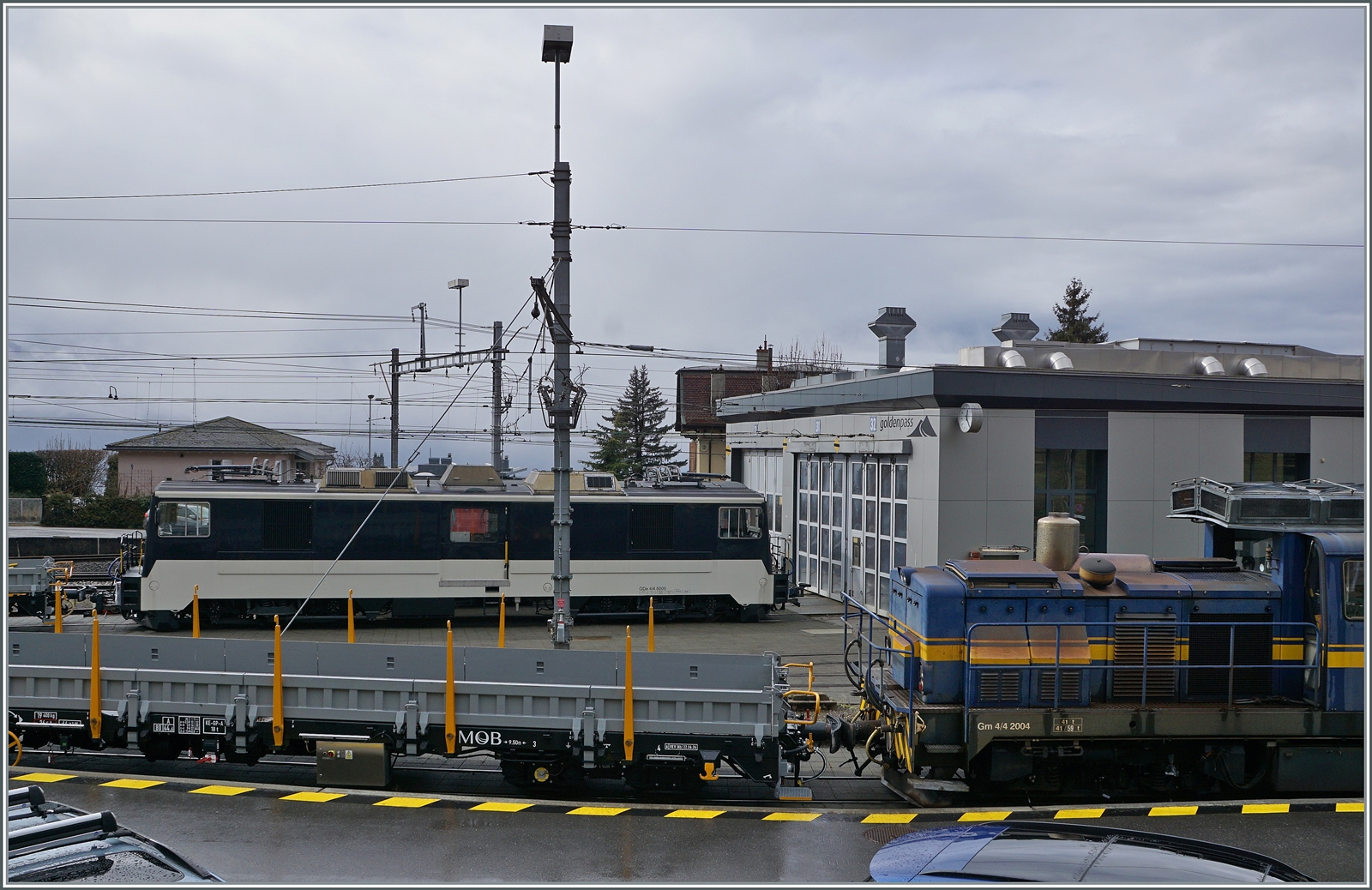 in MOB Güterzug (Dienstzug) verlässt Blonay Richtung Chamby mit der schiebenden MOB GDe 4/4 6001. 7. Juni 2019