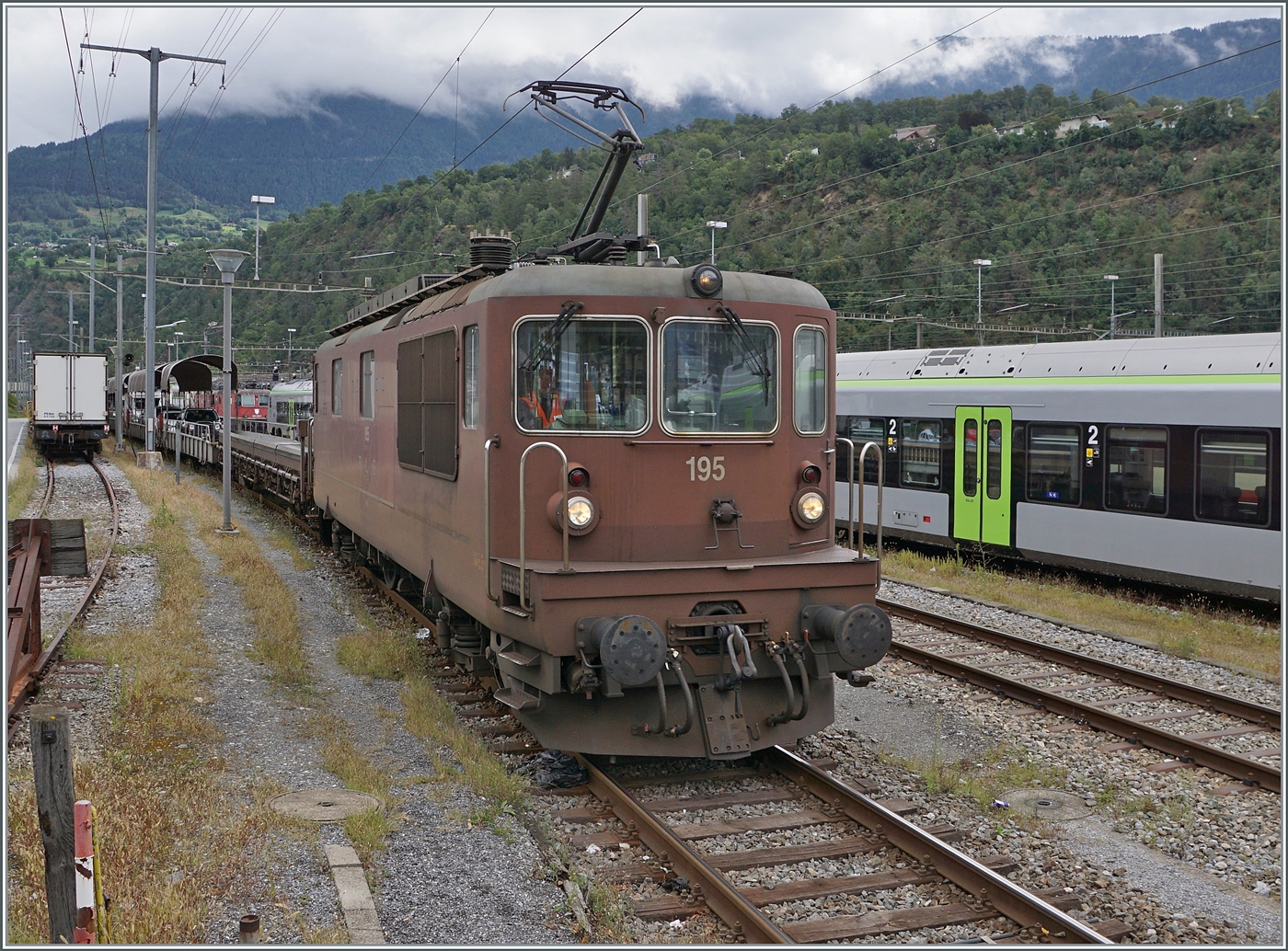 Die BLS Re 4/4 195 erreicht mit ihrem Tunnel-Autozug von Iselle kommend ihre Ziel Brig.