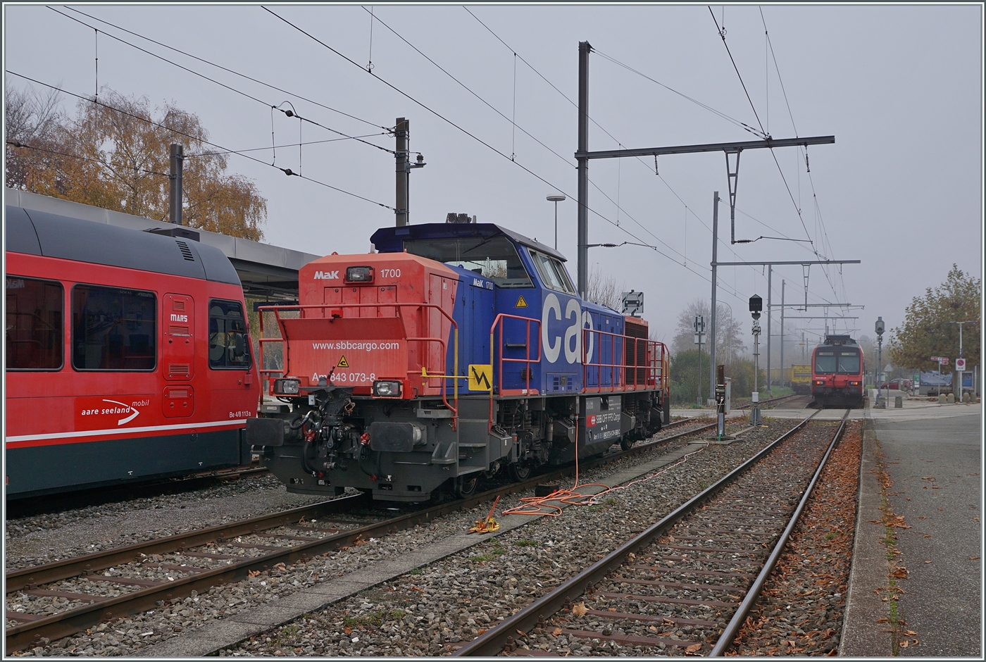 Die Re 420 281-8 (91 85 4420 281-82 CH-SBBC) bzw. Re 4/4 II 11281 der SBB Cargo fährt am 18.05.2018 mit einem Güterzug durch den Bahnhof Neuchâtel (Neuenburg).