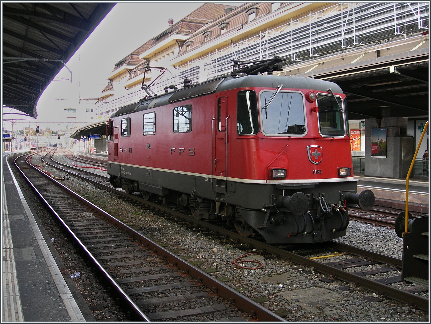 Die SBB Re 4/4 II 11344 (Re 420 344-4 / UIC 91 85 4420 344-4 CH SBBC) mit einer Gleisbaumaschine die auf den Namen "Hummel" hört. bzw. mit D-Krebs 99 80 91 24 011-4 beschriftet ist, beim Abwarten auf die Weiterfahrt in Lausanne. Links im Bild die SBB Re 460 027 mit einem IR90 nach Brig.