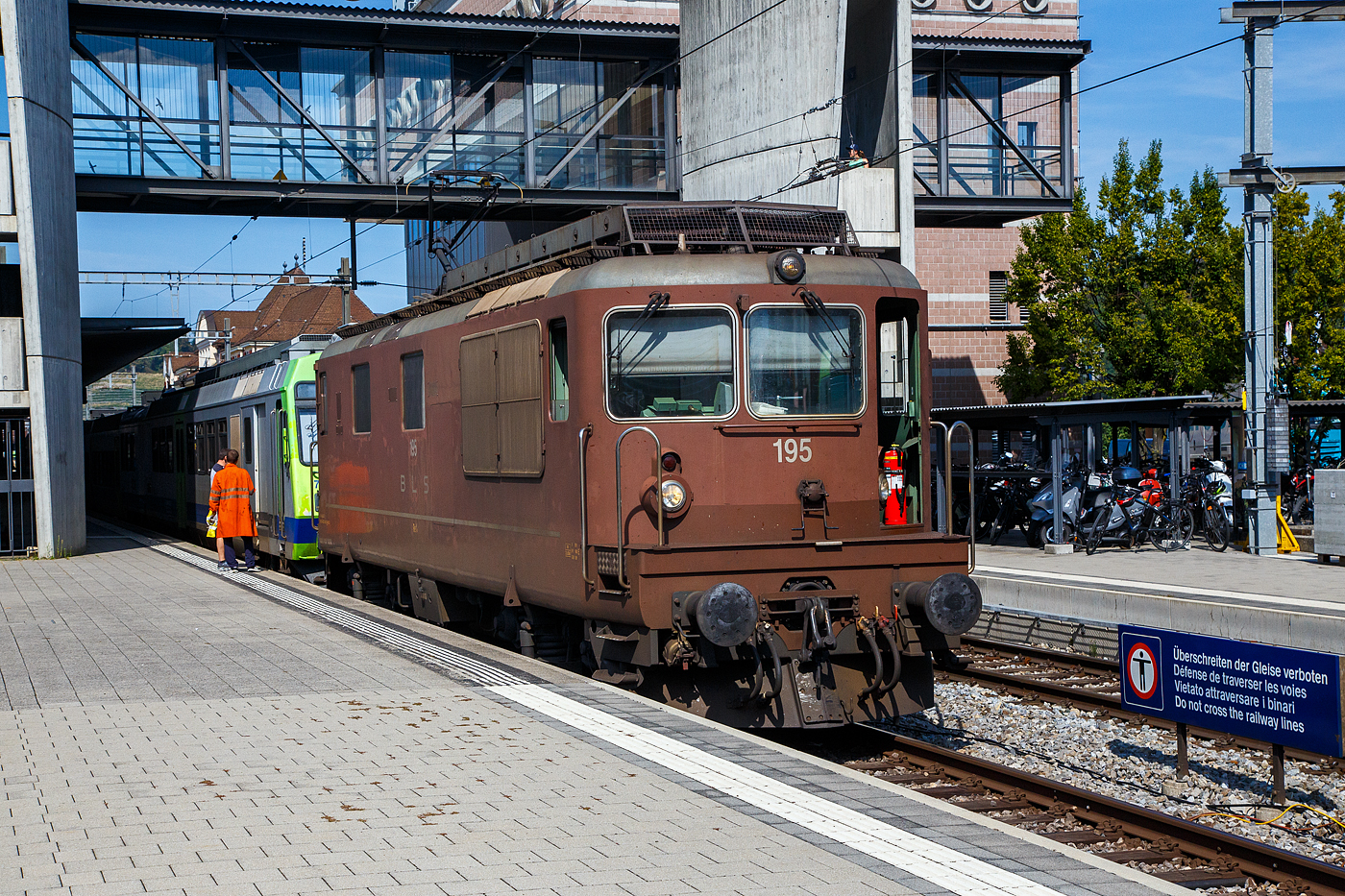 BLS Re 4/4 163 - 165 von 1967, als Ae 4/4 II 263- 265 abgeliefert; die Re 4/4 164 "Lengnau" und eine BLS 465 warten in Vevey auf die Weiterfahrt; links im Bild ist der gelb/blaue "Train des Vignes zu erkennen.