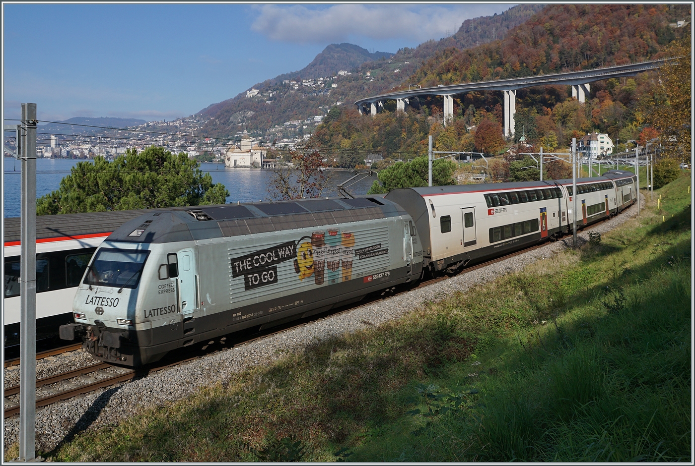 Die SBB Re 460 098-7 mit ihrem IR15 von Genève nach Luzern bei der Durchfahrt in Coppet.