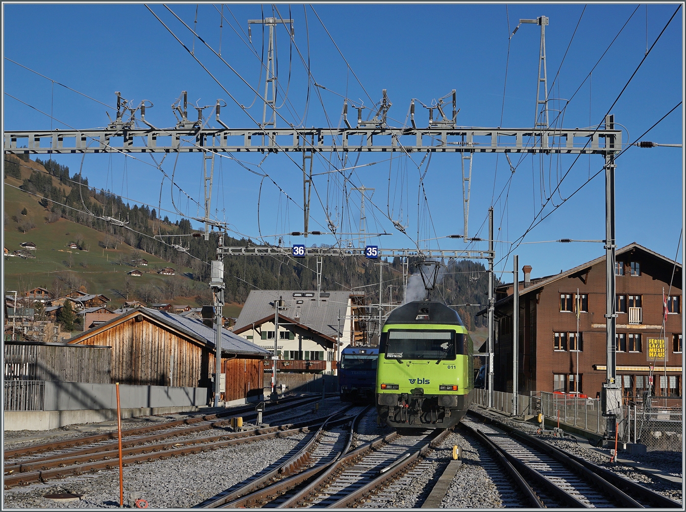 Die BLS Re 465 004 "Kambly" neben einem TPF RABe 527, der ebenfalls mit Werbung versehen ist.