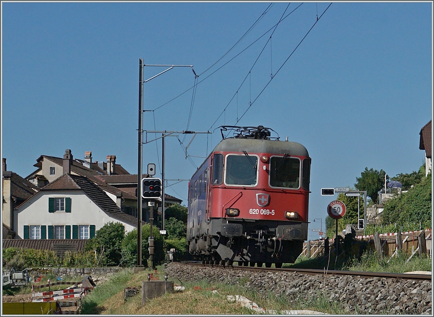 ...und die SBB Re 6(6 11629 (Re 620 029-9) "Interlaken", die mit einem Güterzug kurz vor Villeneuve auf dem Weg in Richtung Wallis ist.
