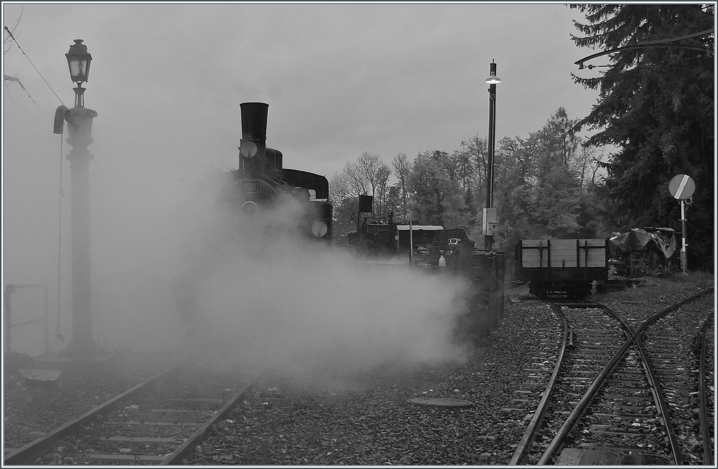 "LA DER 2020 du Blonay-Chamby" / Saison Abschluss der Blonay-Chamby Bahn: Mit einem verstärkten Fahrplan und viel Dampf wird vor dem "Winterschlaf" nochmals viel Betrieb gemacht. Nach der langsamen Fahrt über das Baye de Clarens Viadukt, dampft die G 2x 2/2 105 nochmals recht feste, um die Steigung nach Chamby zu bewältigen.