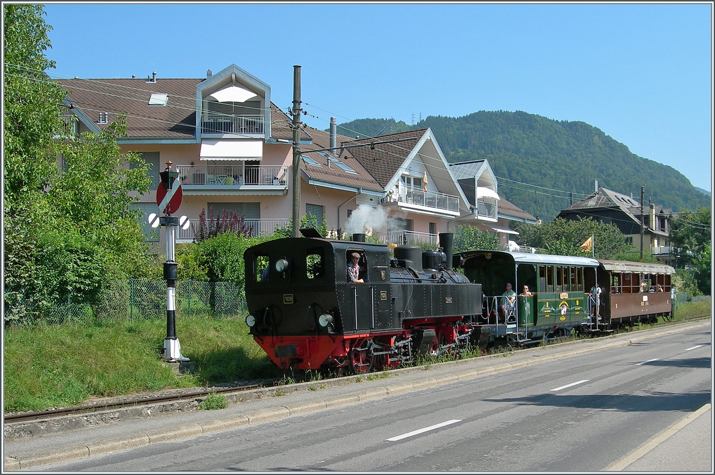 Les chemin de fer disparus - Die verschwundenen Bahnen (LLB 1915 - 1967) Der Leuk Leukerbad Bahn Triebwagen mit der Anschrift ABDeh 2/4 N° 10 erreicht mit seinem Museumszug N° 1009 von Blonay kommend den Bahnhof von Chamby.