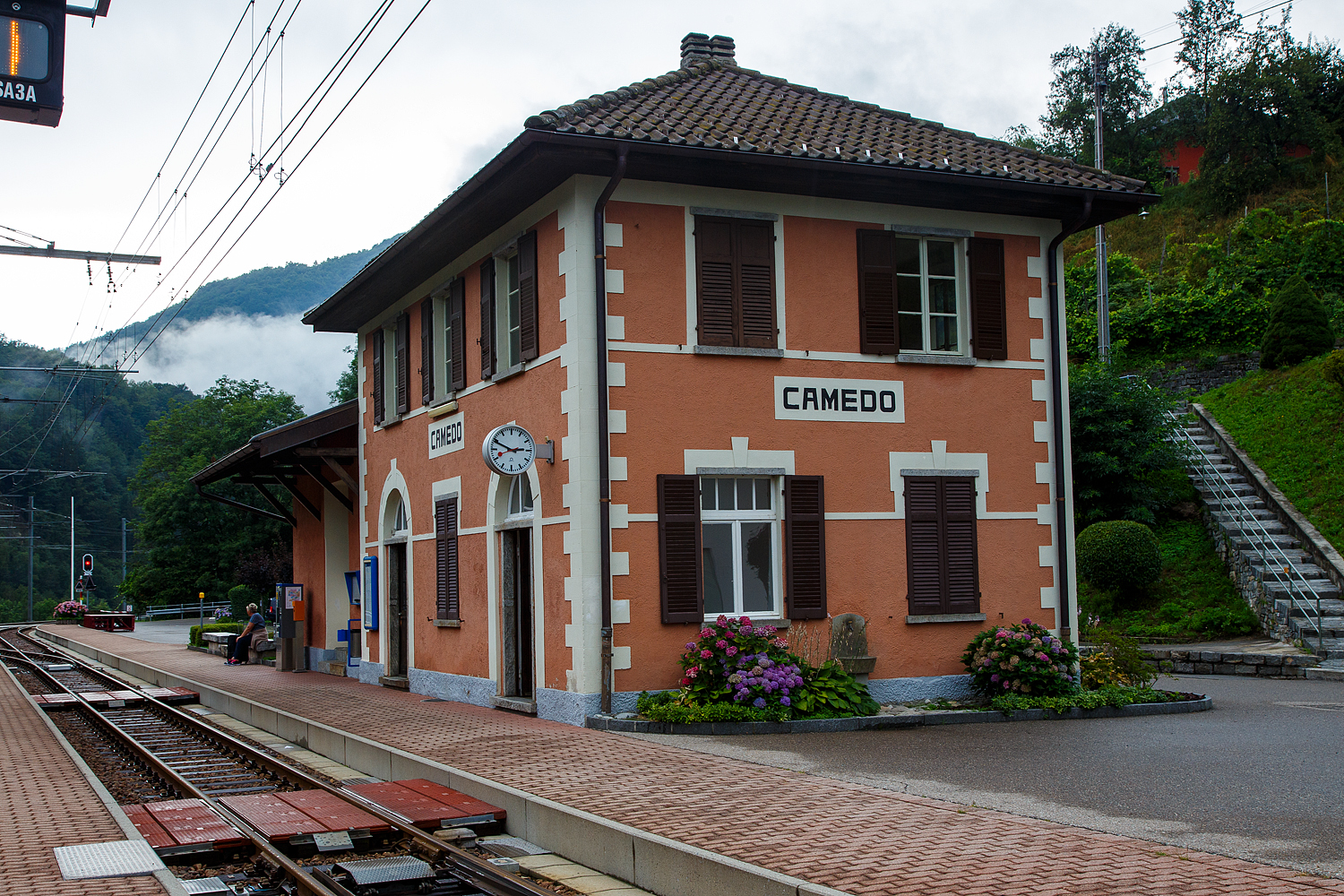 Die beiden „centovalli express“ elektrische Gelenktriebwagen ABe 4/8 48 "Losanna" (90 85 843 0048-1) und 47 "Città di Berna" (90 85 843 0047-3), ex ABe 4/6 58 und 57) der schweizerischen FART (Ferrovie autolinee regionali ticinesi) stehen am 26 Mai 2023 im SSIF-Bahnhof Domodossola (I) zur Abfahrt bereit. SSIF ist die Abkürzung für die Società subalpina di imprese ferroviarie.