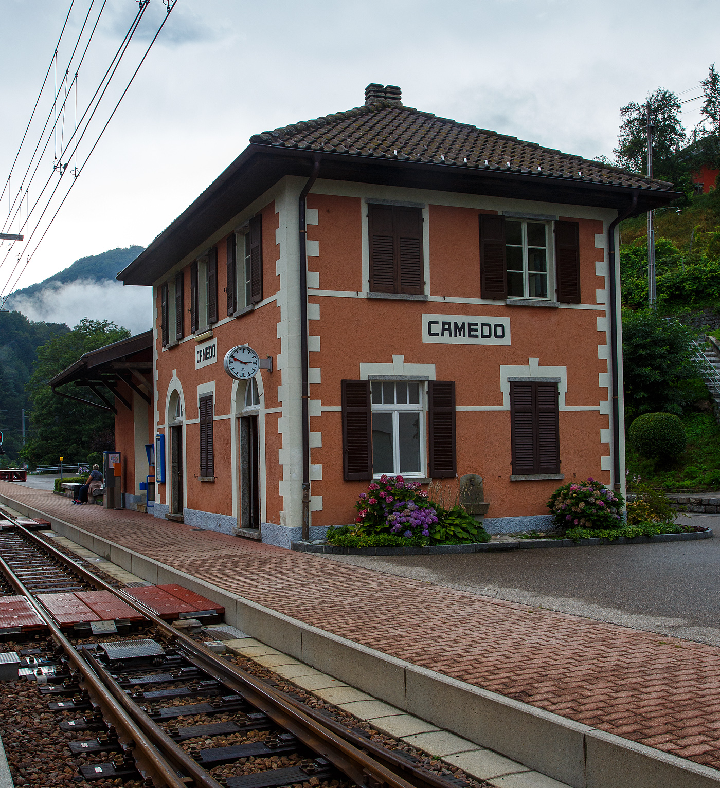 Der Schweizer Grenzbahnhof Camedo der FART - Ferrovie autolinee regionali ticinesi hier am 02 August 2019.