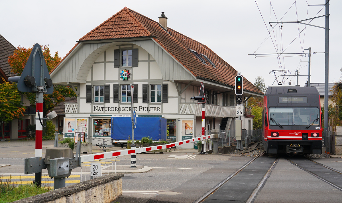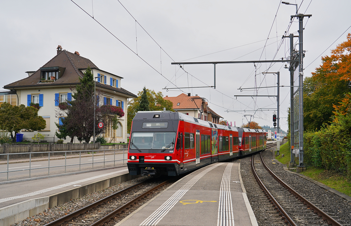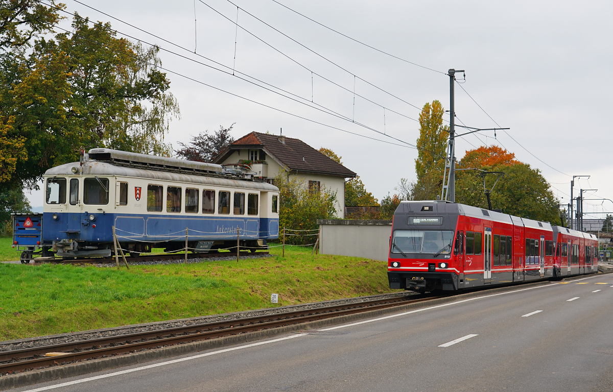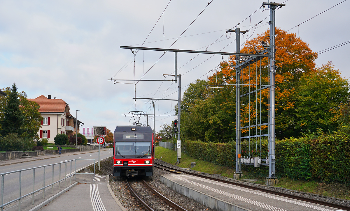 In Chernex steht ein MVR (CEV) GTW Be 2/6 nach Montreux und auf Gleis zwei der MOB Crystal Panoramic Express in Richtung Zweisimmen.