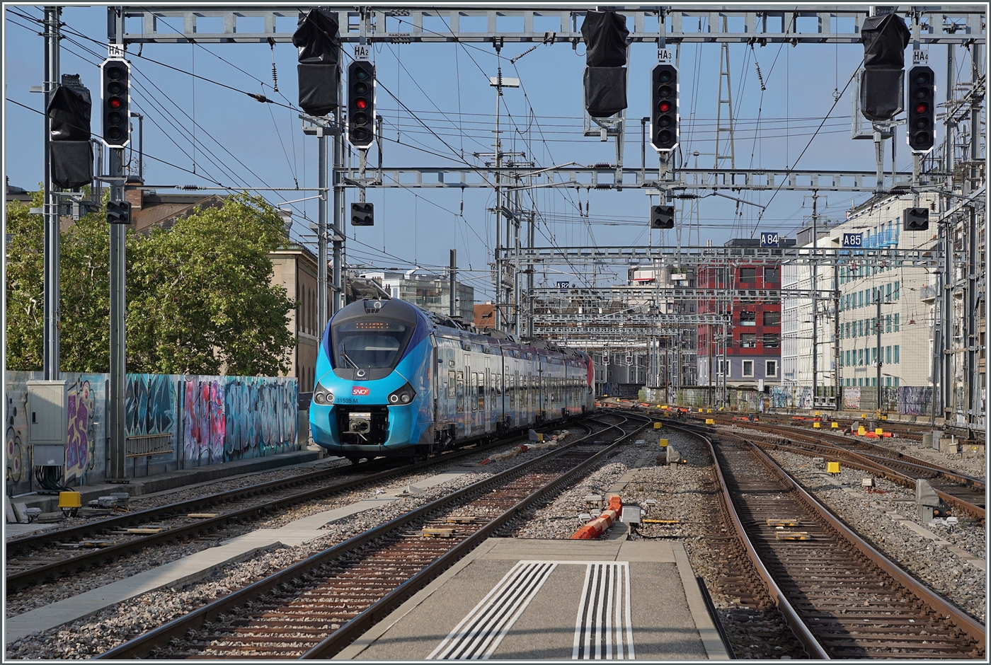 Im Bild zwei ausfahrende SNCF Régiolis tricourant M31549 und 31509, wobei erster mit einem bereits abgewandelten Léman Express Farbkleid daher kommt.