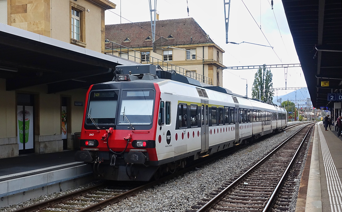 Der mit TPF-Punkten verzierte RBDe 560 243 Domino als R13 von Biel/Bienne nach Yverdon bildet einen schönen Kontrast zu den Betonmauern des Bahnhofs von Concise.