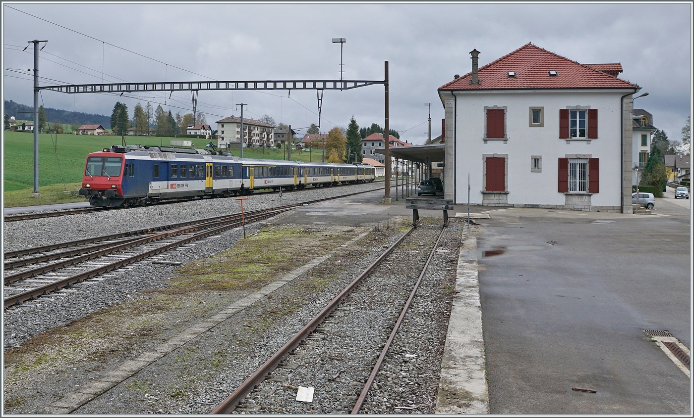 Der RE 18123 von Frasne nach Neuchâtel beim Halt in Travers.
