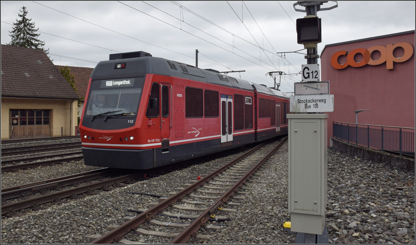 Die beiden Be 4/8 110 (von St-Urban) und 111 (von Solothurn) in Langenthal. Während der Be 4/8 110 in Langenthal bleibt und ins Depot fahren wird, ist der Be 4/8 111 für die Rückfahrt nach Solothurn zurückfahren wird.
