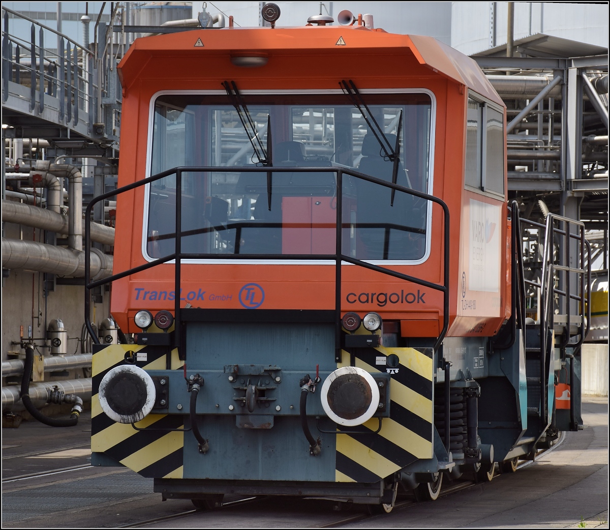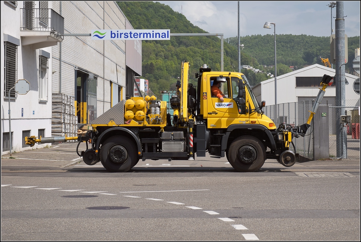 Hafen Birsfelden. Ein Sonderling unter den Rangierloks ist Em 847 856-2 "Bärli" der Petroplus Tankstorage AG. Gebaut wurde sie mit der Fabriknummer 180 der Allrad Rangiertechnik in Heiligenhaus. NVR-Nummer: 98 85 5 847 856-2. April 2018.