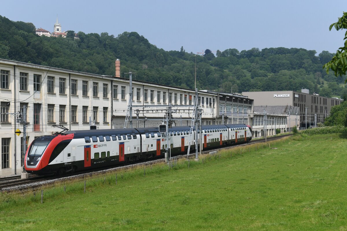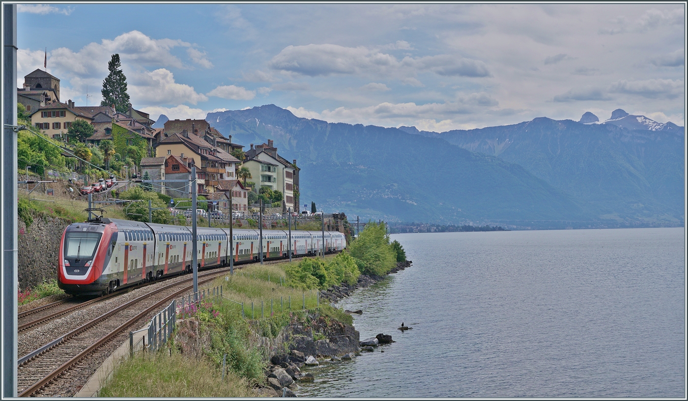 In Rivaz, beim Château de Glérolles tuckert ein Fischerboot vorbei, so dass der Zug im Hintergrund schon fast zur Nebensache wird, obwohl die SBB RABDe 502 hier eher wenig zu sehen sind.
