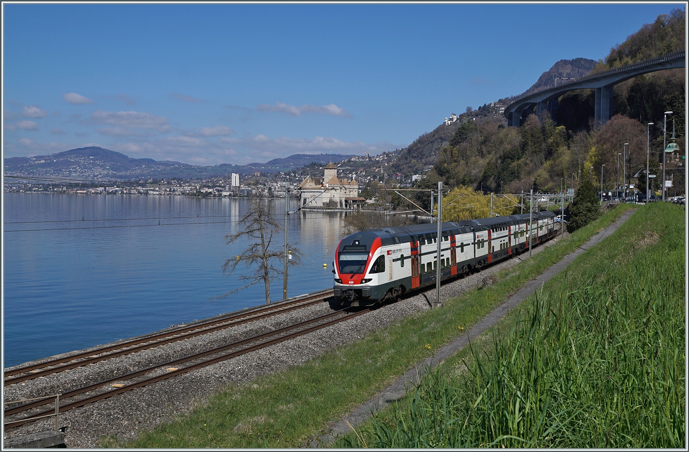 Ein SBB RABe 511 fährt bei St-Saphorin am Ufer des durch einen straken Wind (Jorat) aufgewühlten und türkisblau gefärbten Genfersee entlang.