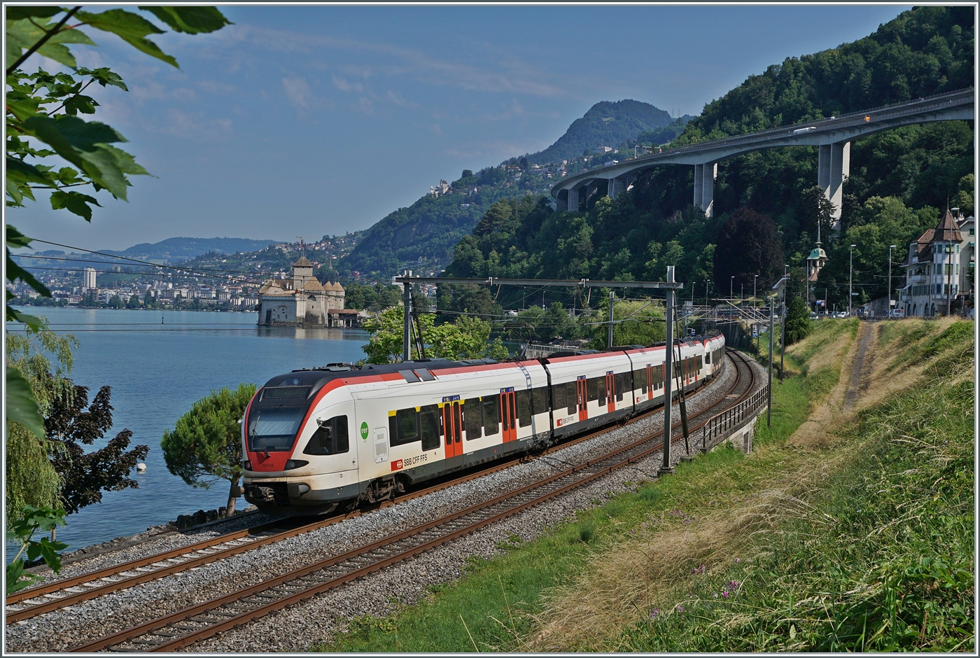 Ein SBB RABe 523 Flirt ist kurz nach Rivaz auf dem Weg nach Aigle und wird in Kürze St-Saphorin erreichen.