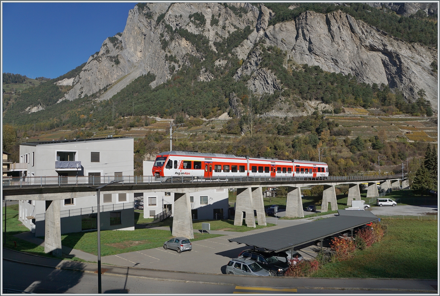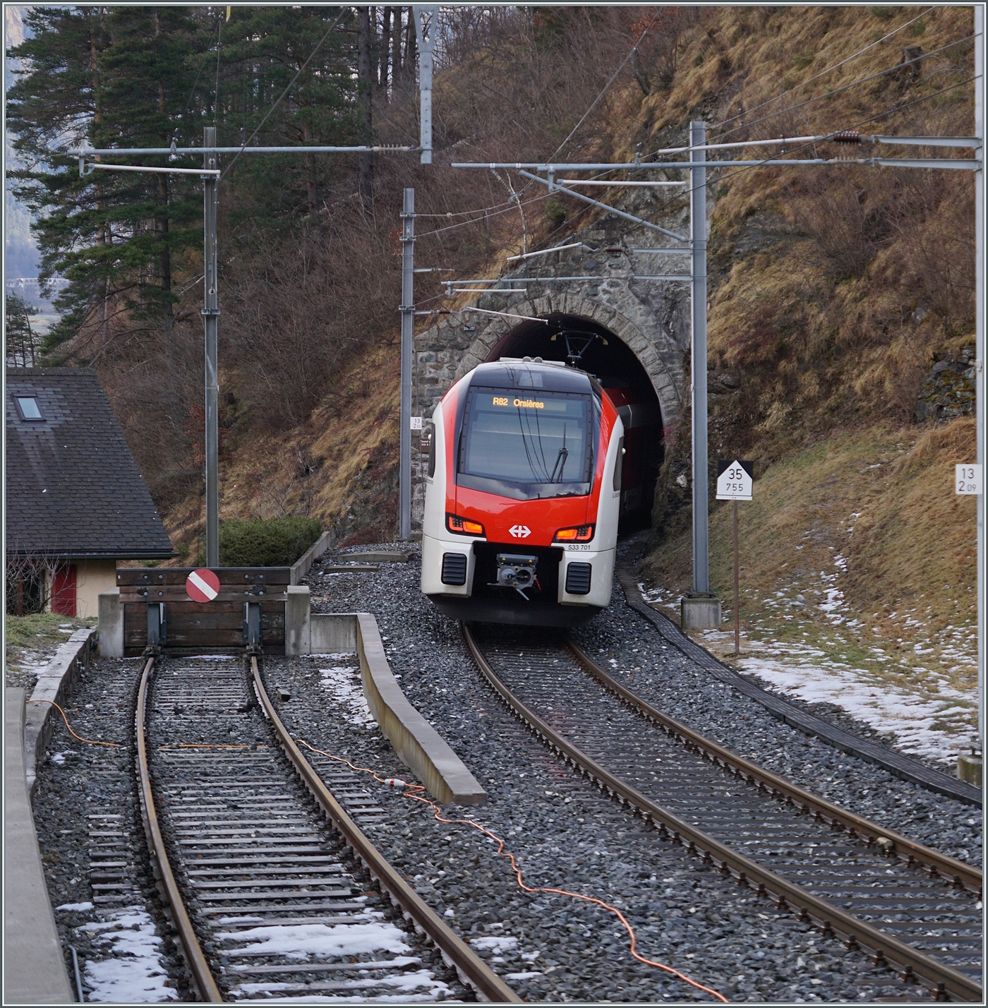 Sembrancher: der aus Orsières angekommene EVO RABe 5233 701 wir in Kürze nach Orsières zurück fahren, während auf Gleis 2 der Anschlusszug nach Martigny, bestehend aus zwei TMR RABe 525 NINA zu sehen ist.
