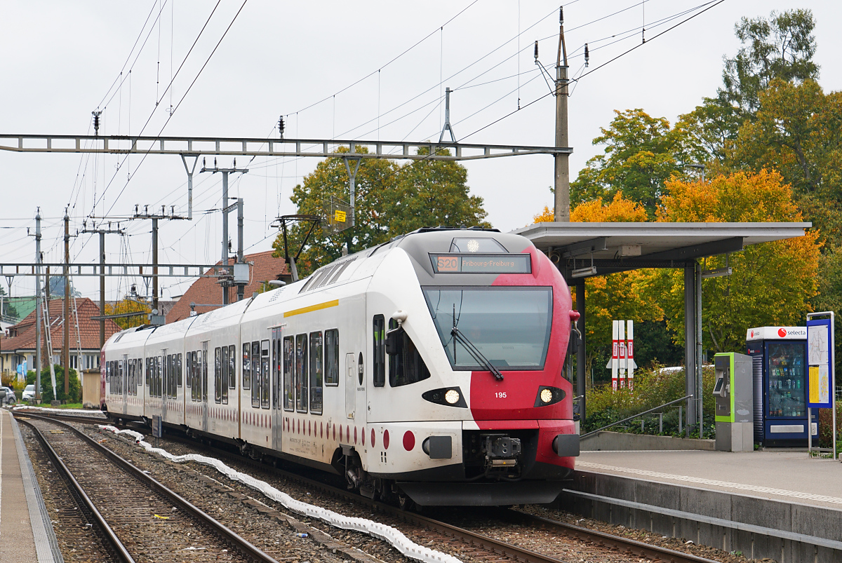 "RVT-Flirt" in Fleurier. RABe 527 333 ist im Eigentum von TRN, das heute auch unter TransN firmiert. Nach seiner Einfahrt ist die Strecke für den Dampfzug frei. Mai 2024.