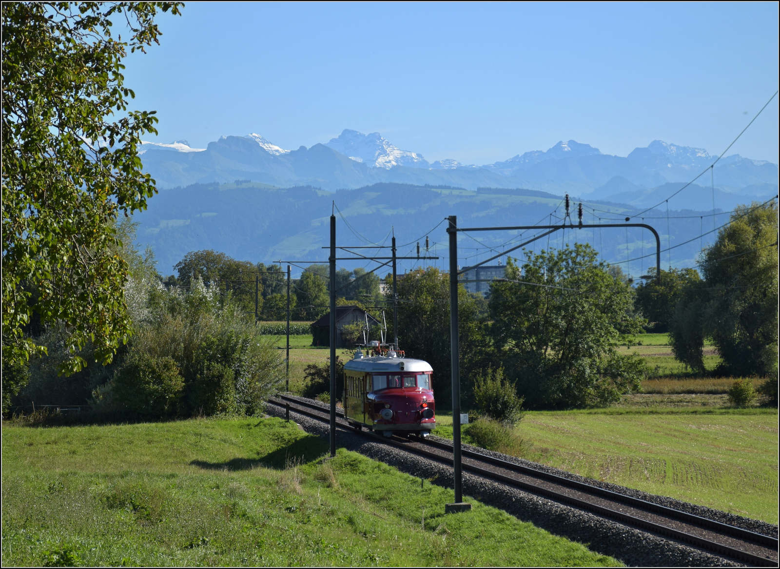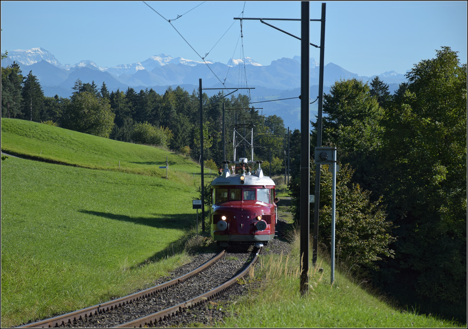 Der Rote Pfeil der Oensingen Balsthal Bahn/OeBB mit dem neuen Anstrich als SBB RCe 2/4 607 in Balsthal am 22. März 2023.