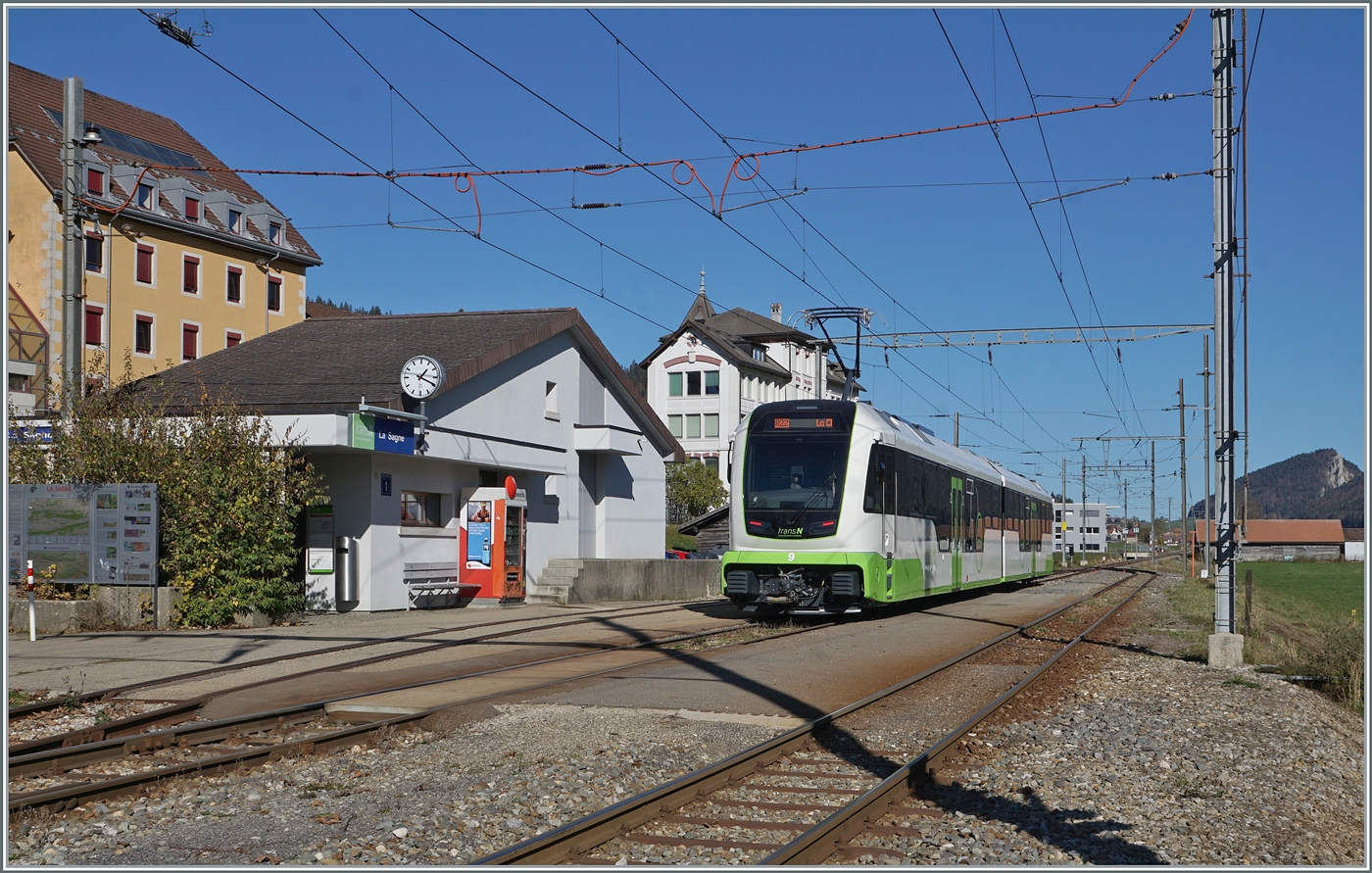 Der von der SBB langfristig gemietet RABe 523 074 der transN wartet in La Chaux de Fonds auf die Abfahrt als RE nach Neuchâtel.