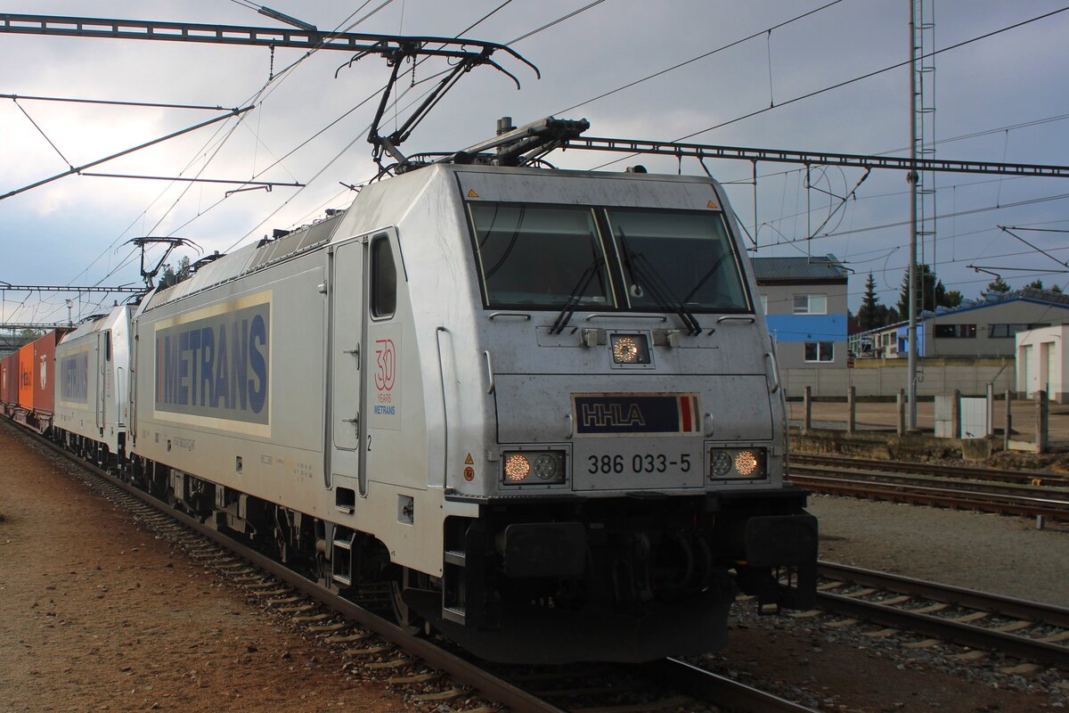 Vom Bahnsteig aus wurde am 27 September 2025 der Metrans Doppelpack mit 386 033 führend in Benesov u Prahy fotografiert.